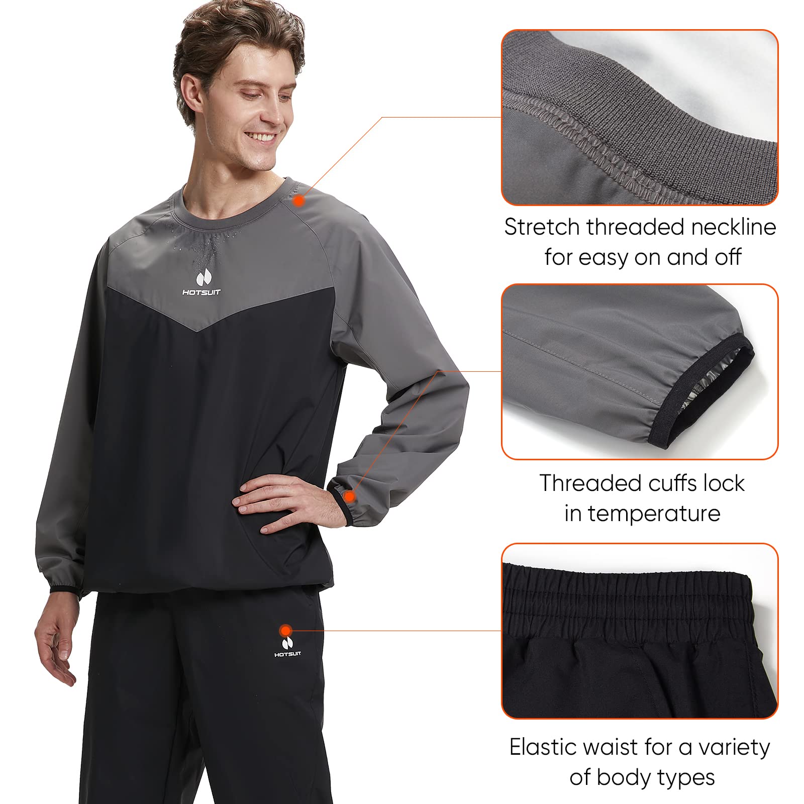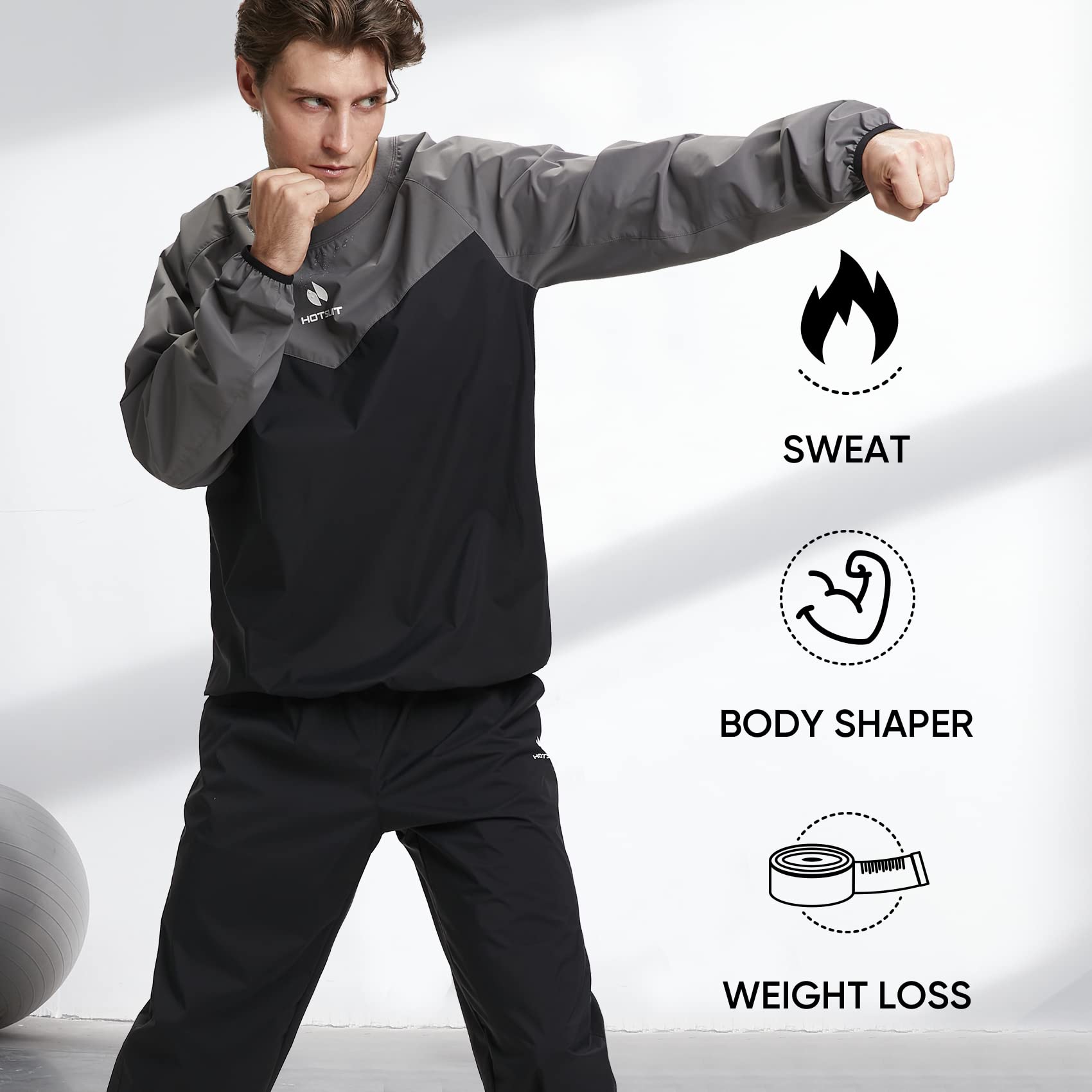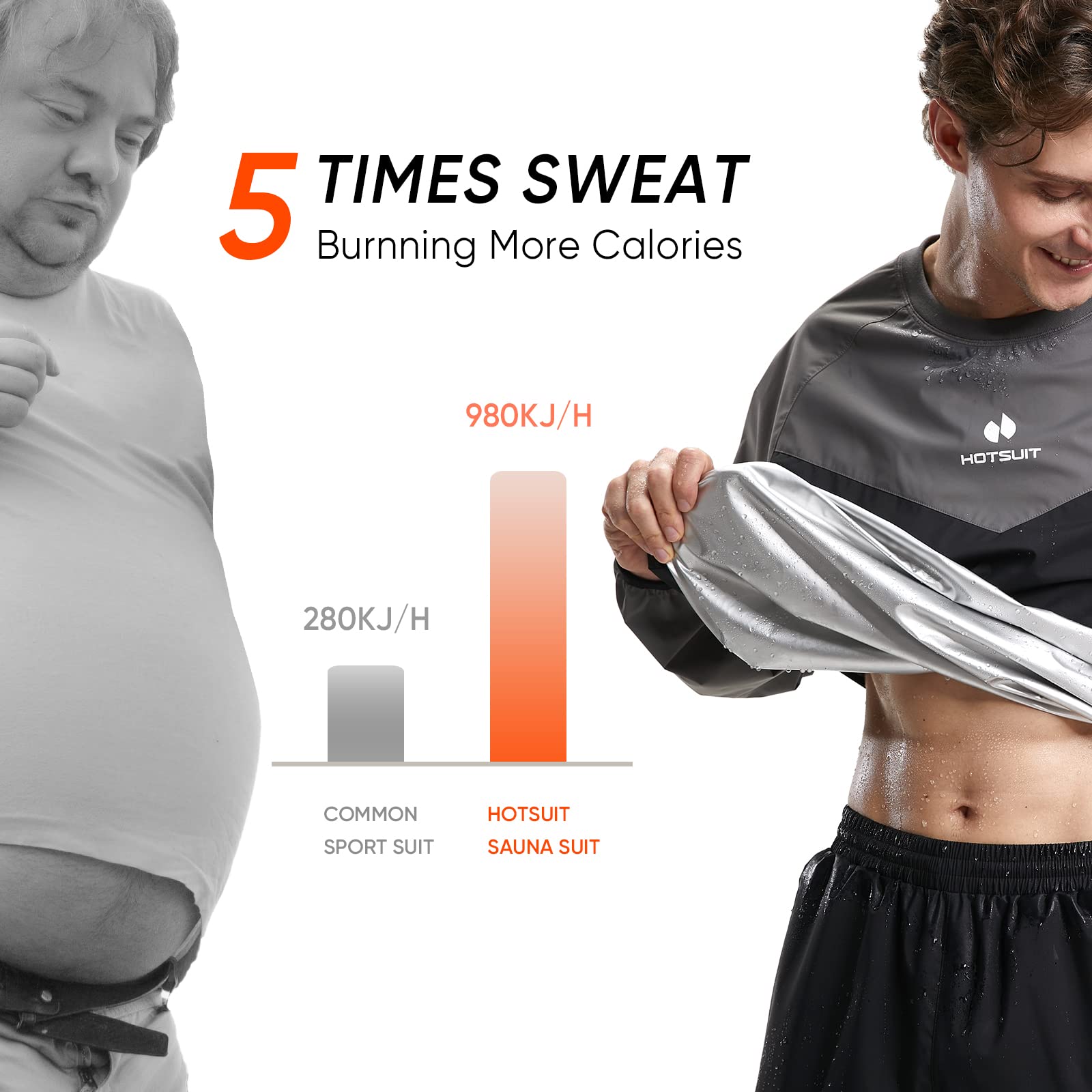 - Enhance your workout effect, make you sweat a lot: HOTSUIT new sauna suits are designed to reduce body extra water weight used by boxers or athletes before competition. Exercise with sweat suit, will make you 5 times sweat, help you burn more fat and calories, and let you enjoy sweating during the sport activities.