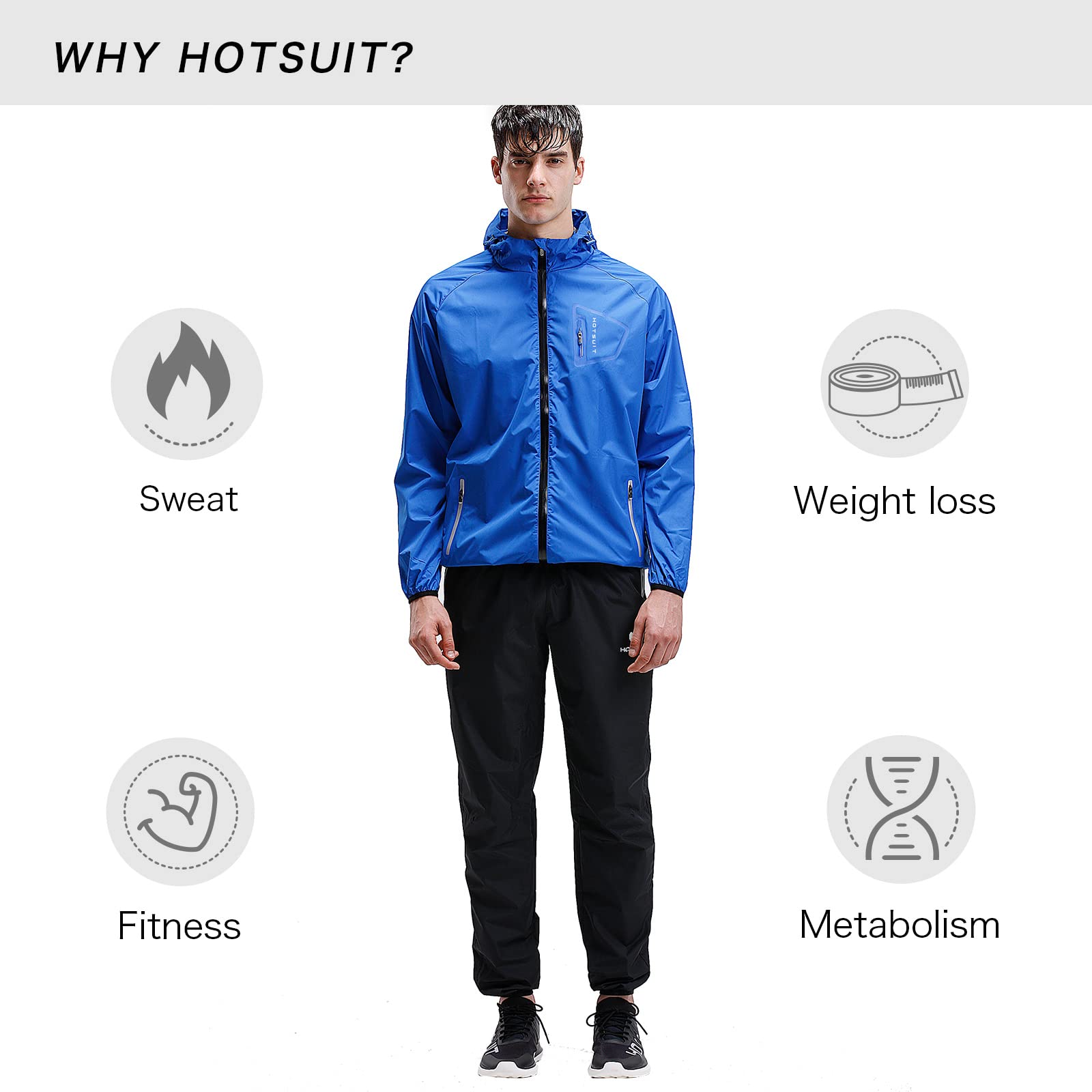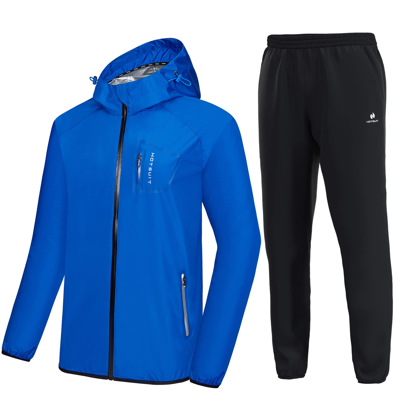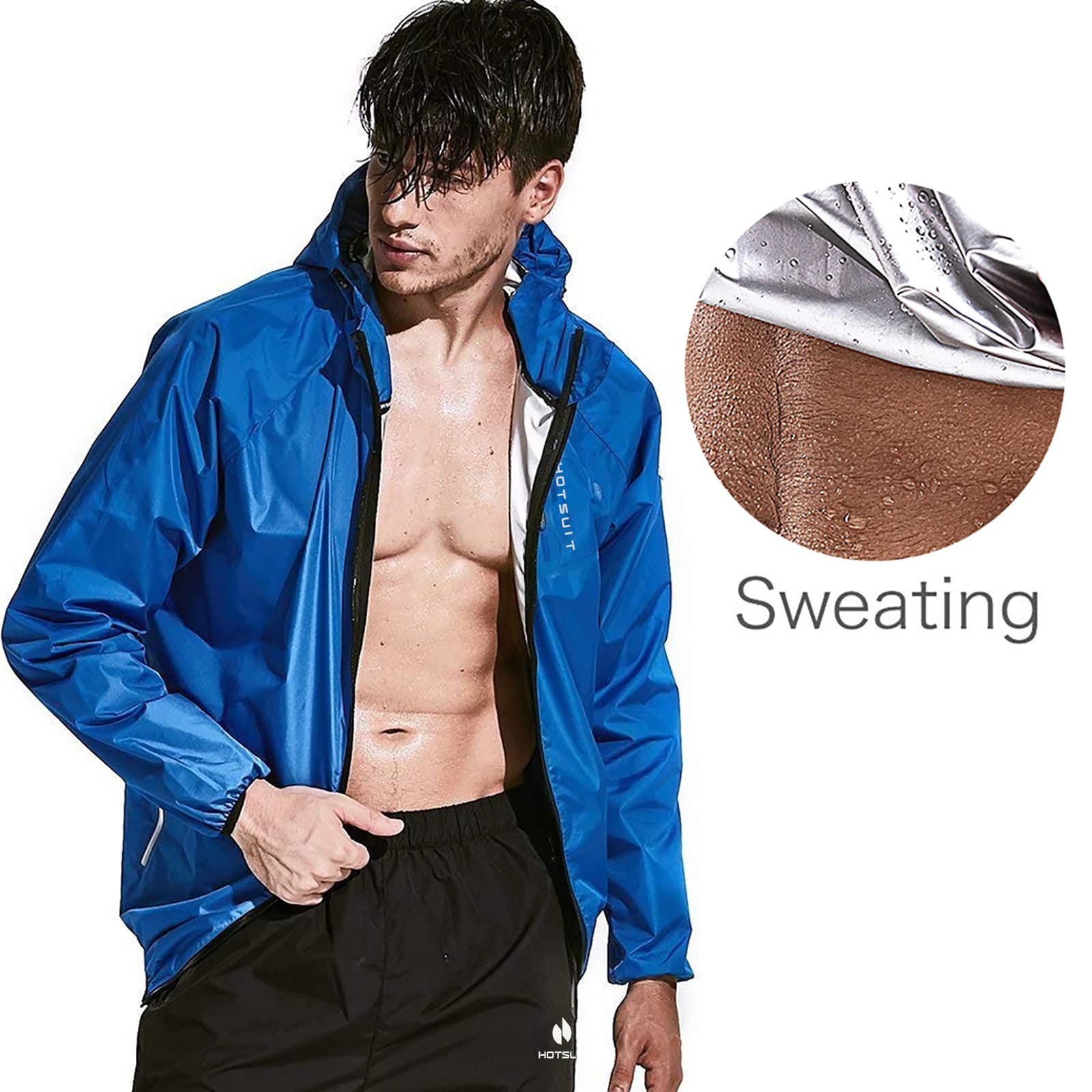 HOTSUIT Sauna Suit Men Weight Loss Anti Rip Sweat Suits Workout Jacket. HOTSUIT sauna suit has been scientifically proven can be widely used to body shape control and effective lose water weight, HOTSUIT sauna suit uses our own technology fabric 'nano-sliverN9000' it's independently research and develop, It produces and retains body heat within the garment, Through the special fabric, the heat will assemble fast, sweat gland can perspire rapidly, It is designed to cause sweat profusely for an effective body shaping and water weight loss. HOTSUIT sauna suit design in fashionable element, it is different from other brand's traditional sauna suit. Waterproof zipper pockets designed on both sides of the pants. Virtual pockets on the upper clothes. The hood incorporates an elastic binding. Drawstring for the pants to best suit a wide range of body sizes. Light-reflecting LOGO placed on left side sleeve. The suit is suitable for a variety of physical activities. Including boxing, weightlifting, yoga, and fitness training. Our Sauna suit made of smooth and unique materials, more breathable, more comfortable,compare with most of other sauna suit, HOTSUIT sauna suit can increase sport efficiency and protect your skin at the same time.