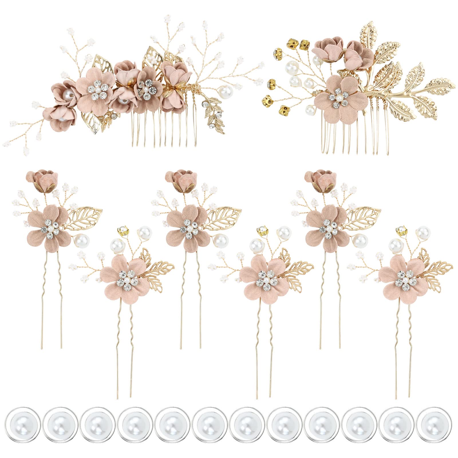 - Dusty Pink Set: What You Get: 20 pack dusty pink flower hair pins combs accessories for wedding prom in total as photo show (2pcs flower hair side combs+6pcs U-shaped flower hair pins+12pcs twist pearl hair pins) in the good package.