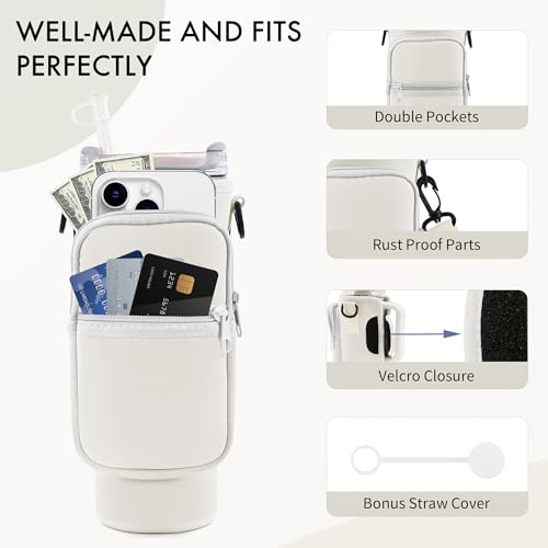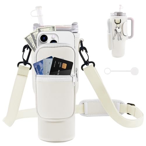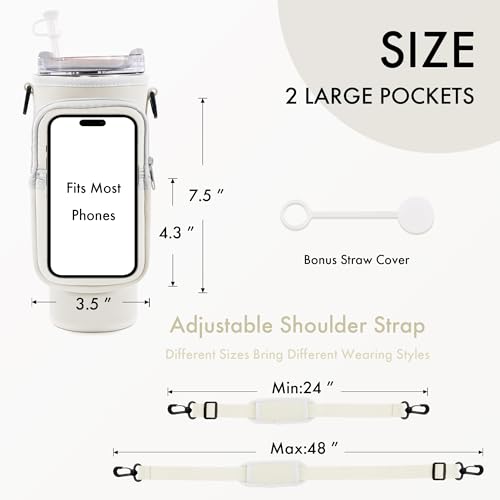 JEBEALUO Water Bottle Carrier Bag with Phone Pocket for Stanley Cup 40/30 oz, Water Bottle Holder with Adjustable Strap& Straw Cover, Stanley Cup Accessories (Black)