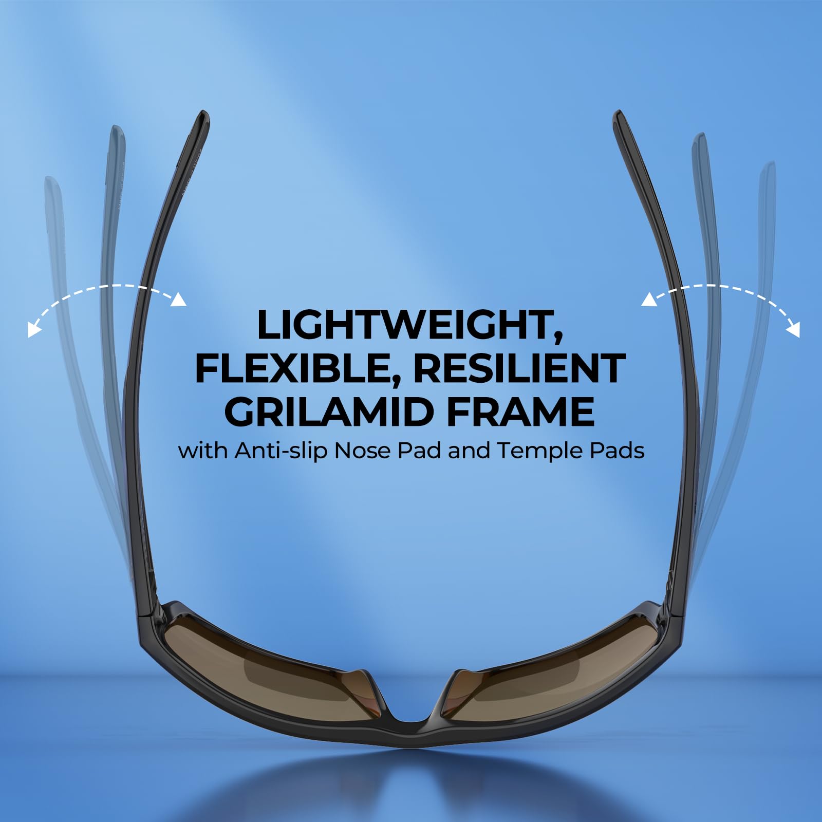 - PREMIUM FRAMES β Made of Grilamid material commonly used by the military and in medical applications, KastKing frames are lightweight, extremely flexible and heat and UV resistant. The tacky nose pads and temple pads help to prevent slipping. The angular wrap design offers full coverage that blocks light and increases visibility, making it ideal for various activities like driving, biking, running, boating, fishing, and golfing.