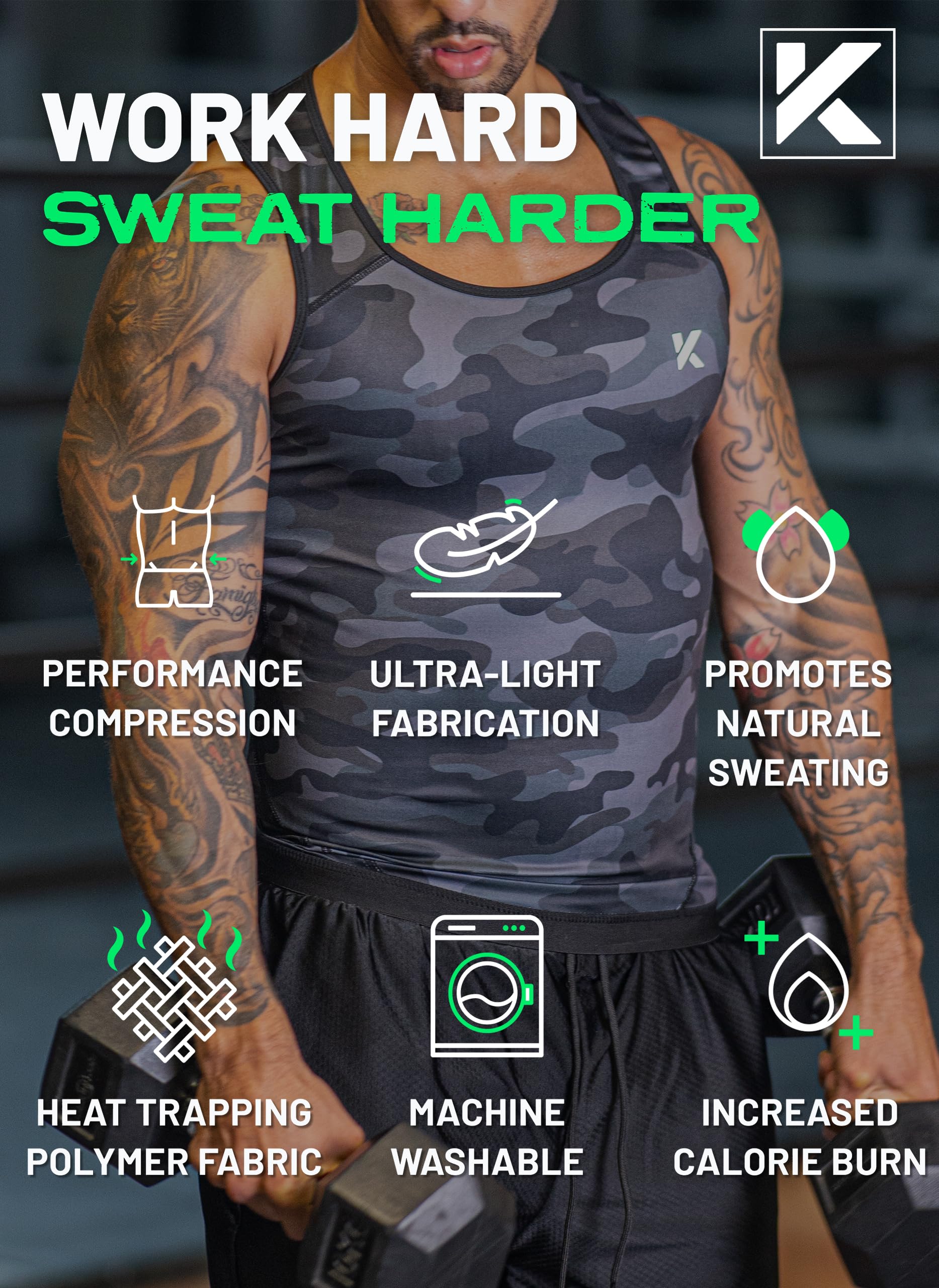- SWEAT MORE: Wearing this workout sweat vest during ANY physical activity creates a hot-sauna like experience including many of the same scientifically proven health benefits. By simply putting on this mens sauna shirt you'll instantly feel the heat and sweat 3x more.