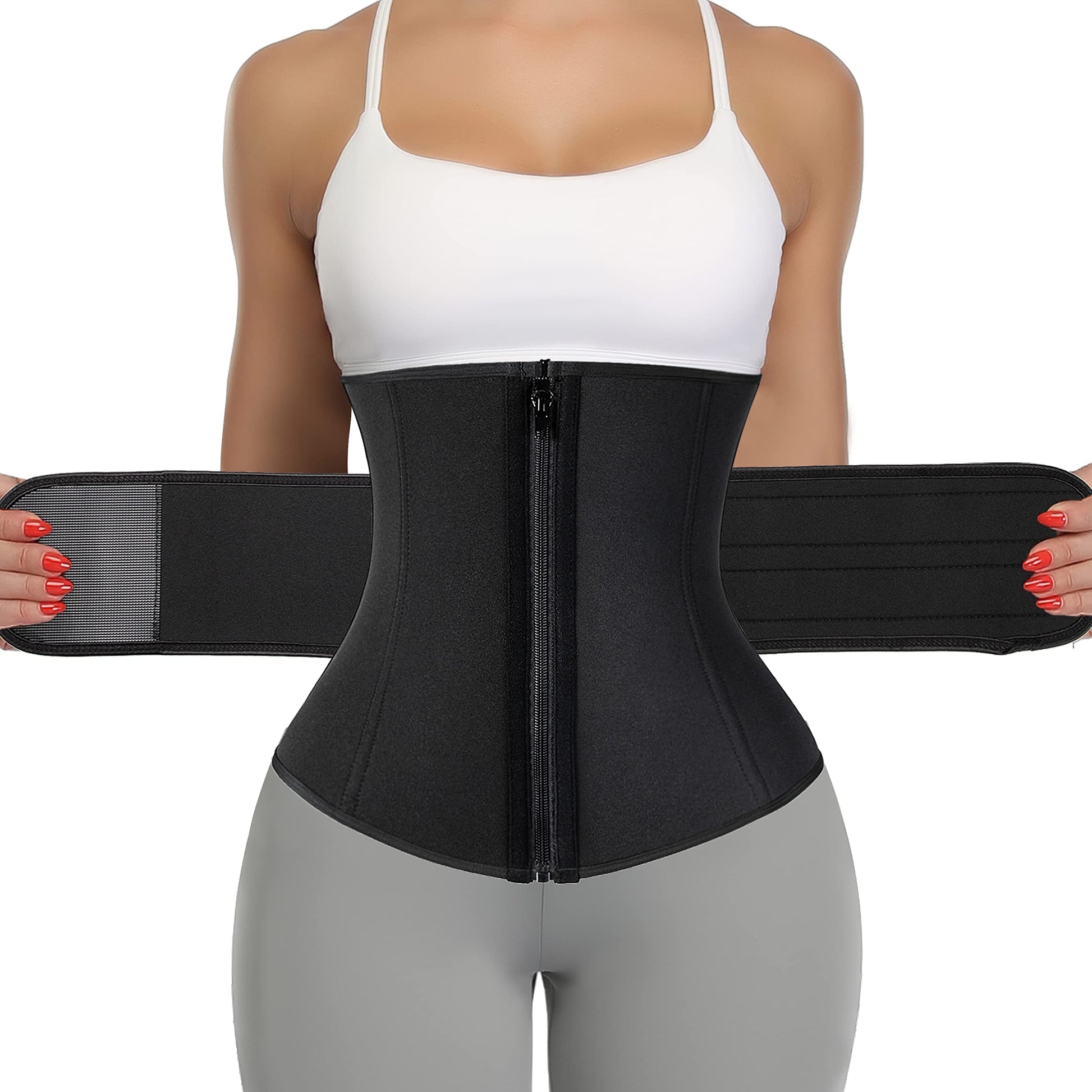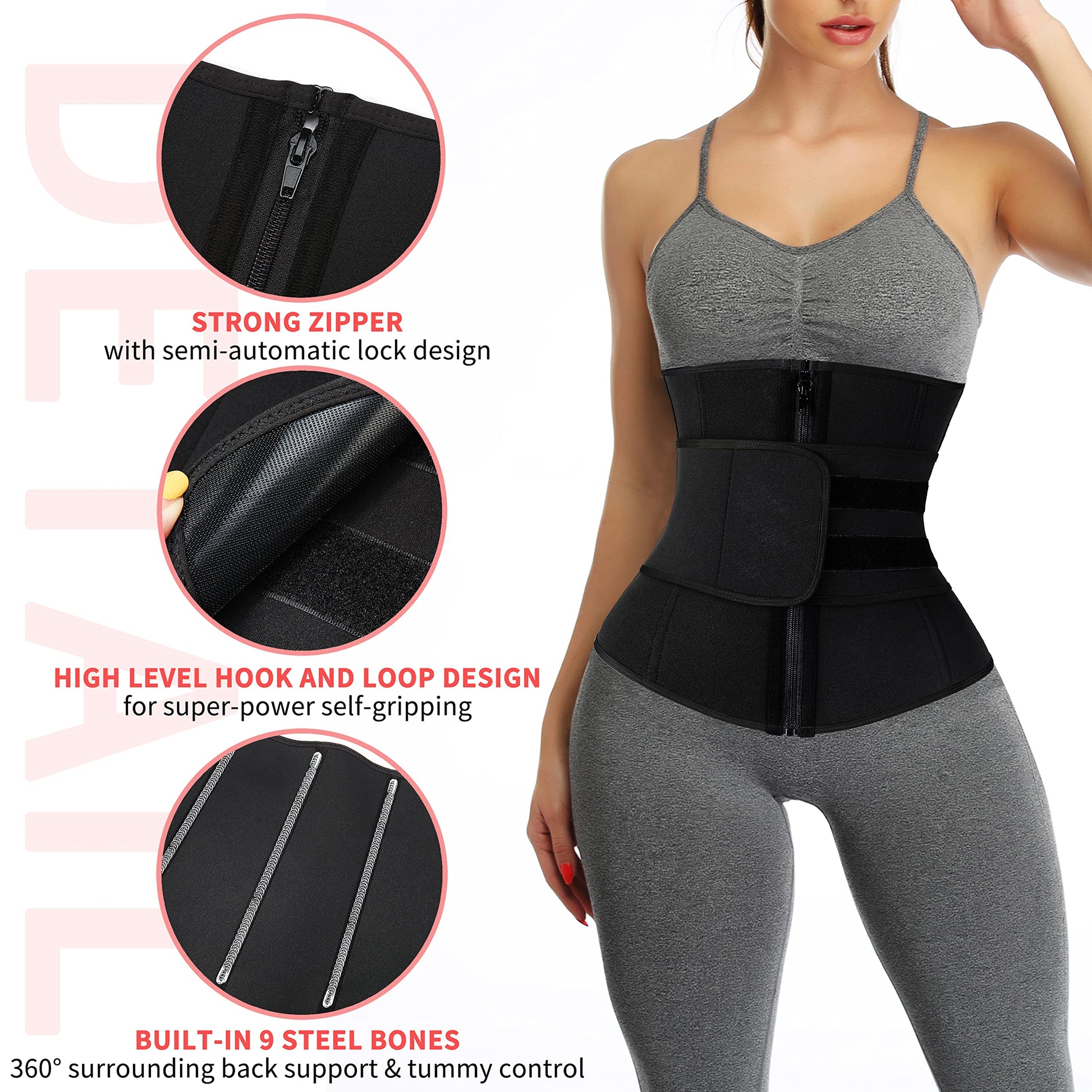 KIWI RATA 2 in 1 Neoprene Sauna Waist Trainer Corset Sweat Belt for Women Tummy Control Bands Compression Workout Fitness Trimmer,#1 Zipper Black,Medium