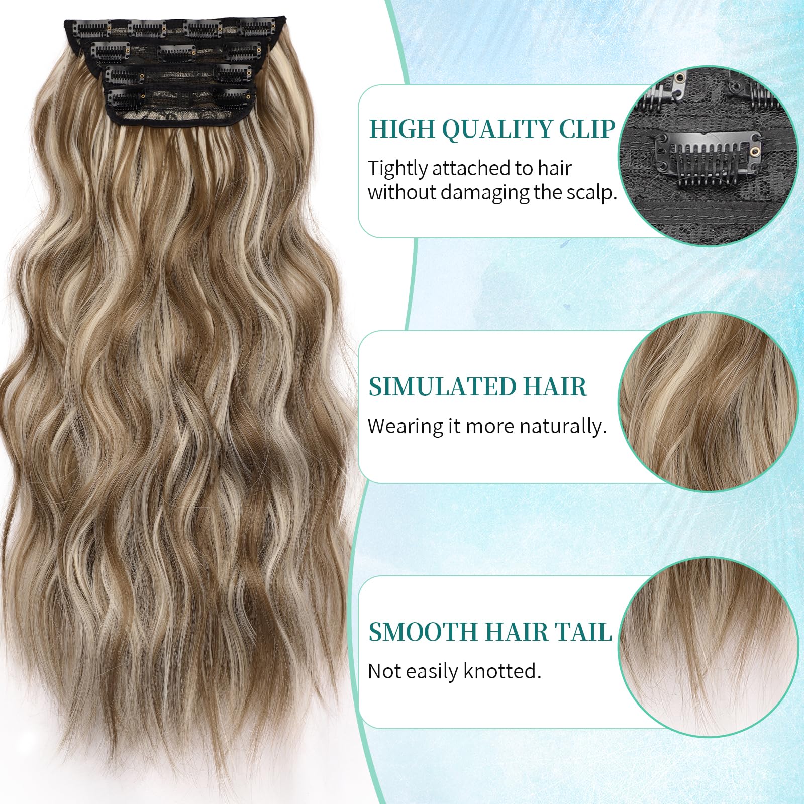 Details: KooKaStyle Clip in Synthetic Hair Extensions Long Wavy 4PCS Thick Hairpieces Brown mix Ash Blonde P10/88 Fiber Double Weft Natural Hair Extensions 20 Inch for Women