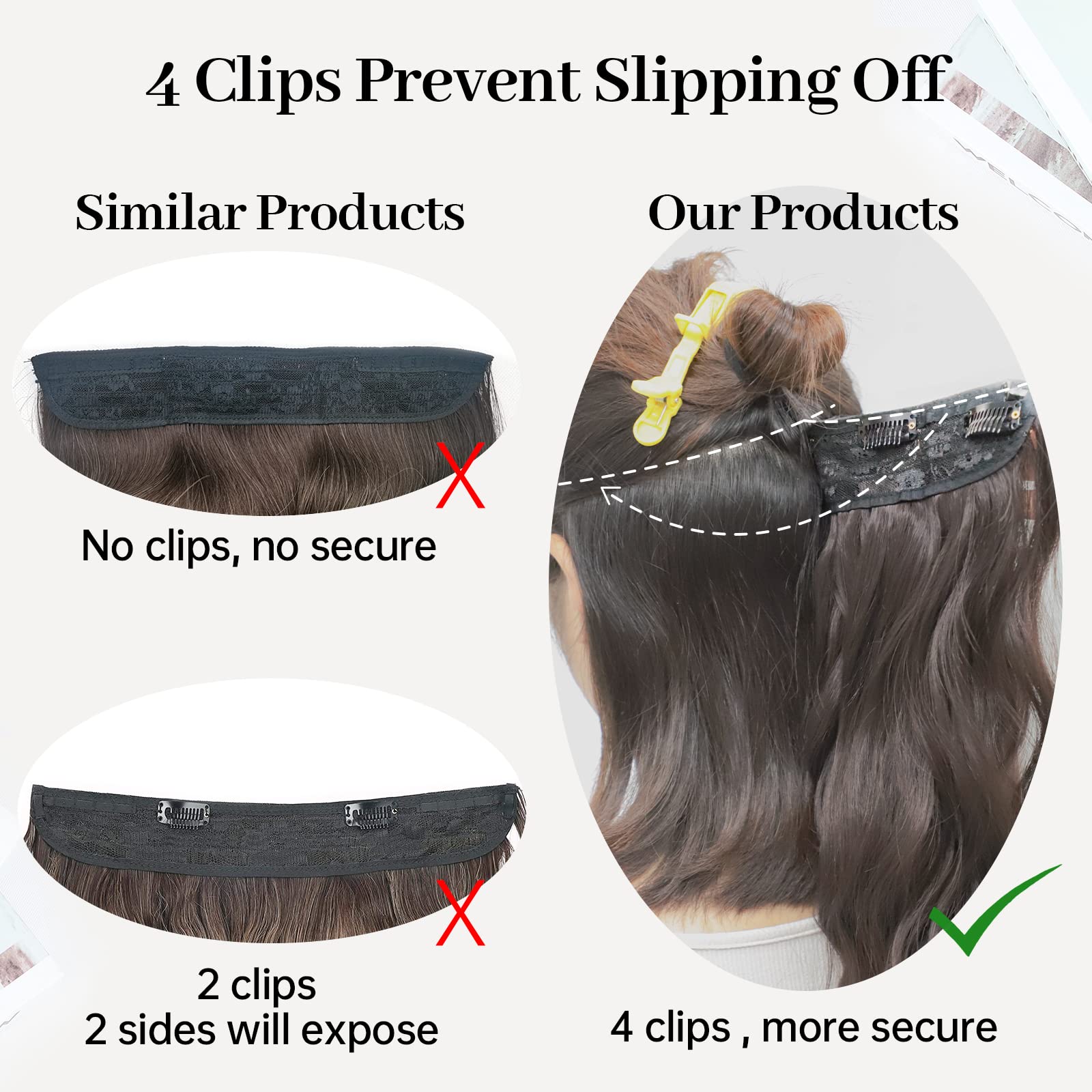 - Secure Fit: 1. 4 clips sewn on the weft will keep the hair extensions stay in place. 2. Thicker and invisible wire allows the extension to lie smooth and flat on the head like a secret headband. 3. New S Hook will prevent the wire from falling off.