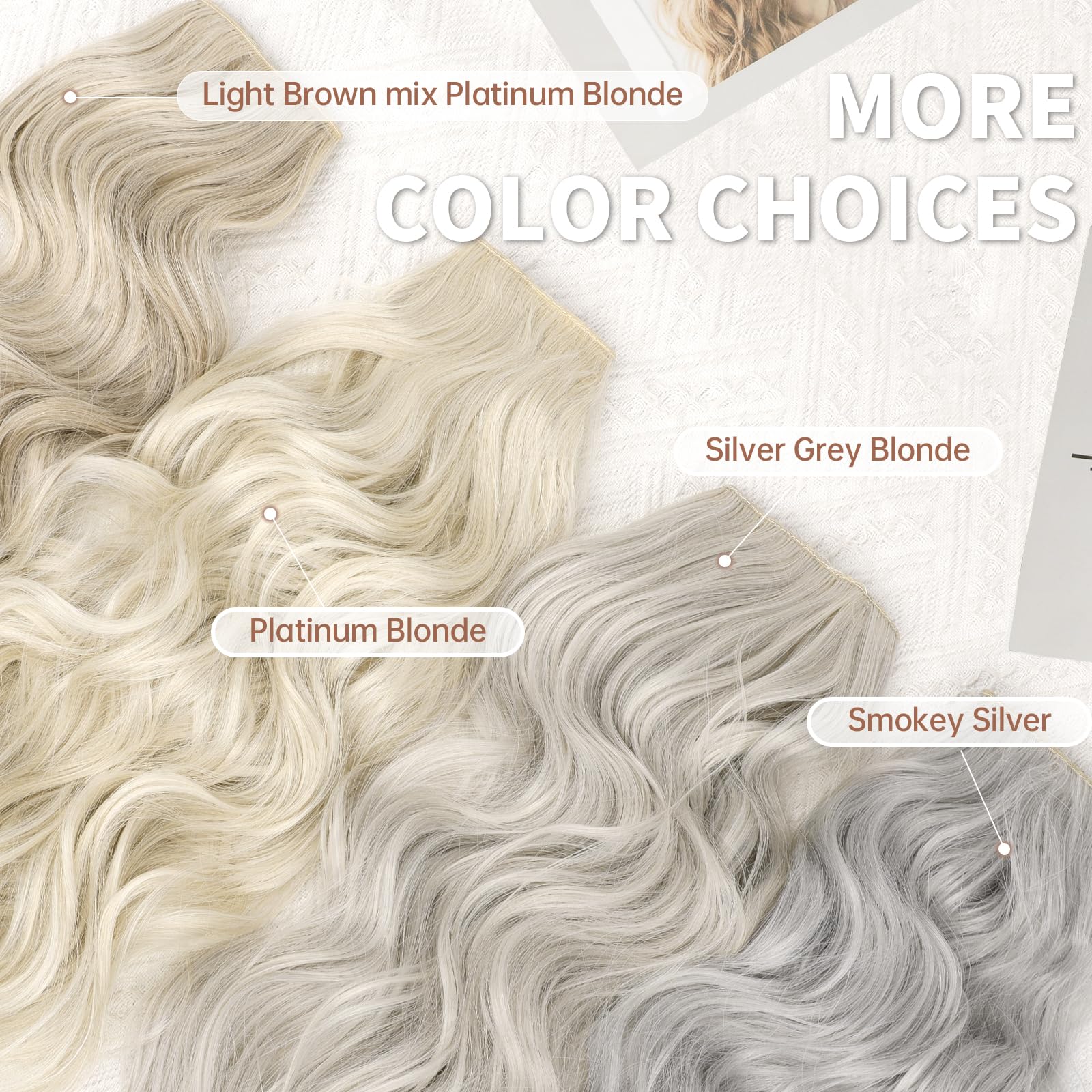 KooKaStyle Invisible Wire Hair Extensions with Transparent Wire Headband Adjustable Size 4 Secure Clips Silver Grey Blonde Long Wavy Hairpiece for Women