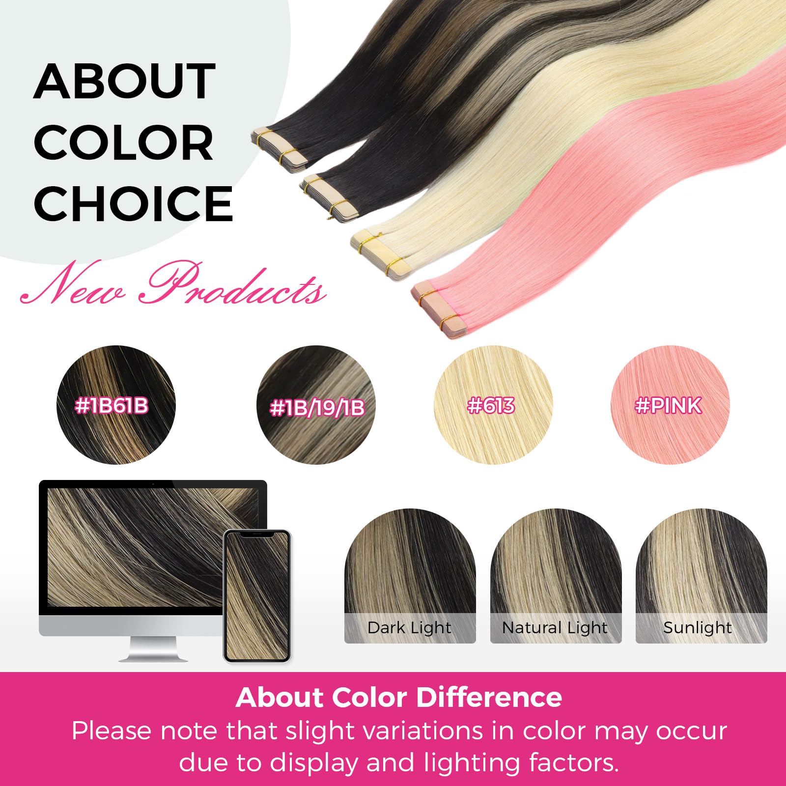 - [Excellent Color Match & Highlighted Effect] Our tape in human hair extensions are designed to match your hair color perfectly, with a natural shine. Black, dark brown, pink, blonde, black mixed chestnut brown and balayage natural black to light blonde are available. According to your needs, make any highlights effect you want You can do as you like strengthened or curled. It's better to do this by professionals, please keep the temperature below 350 Fahrenheit.