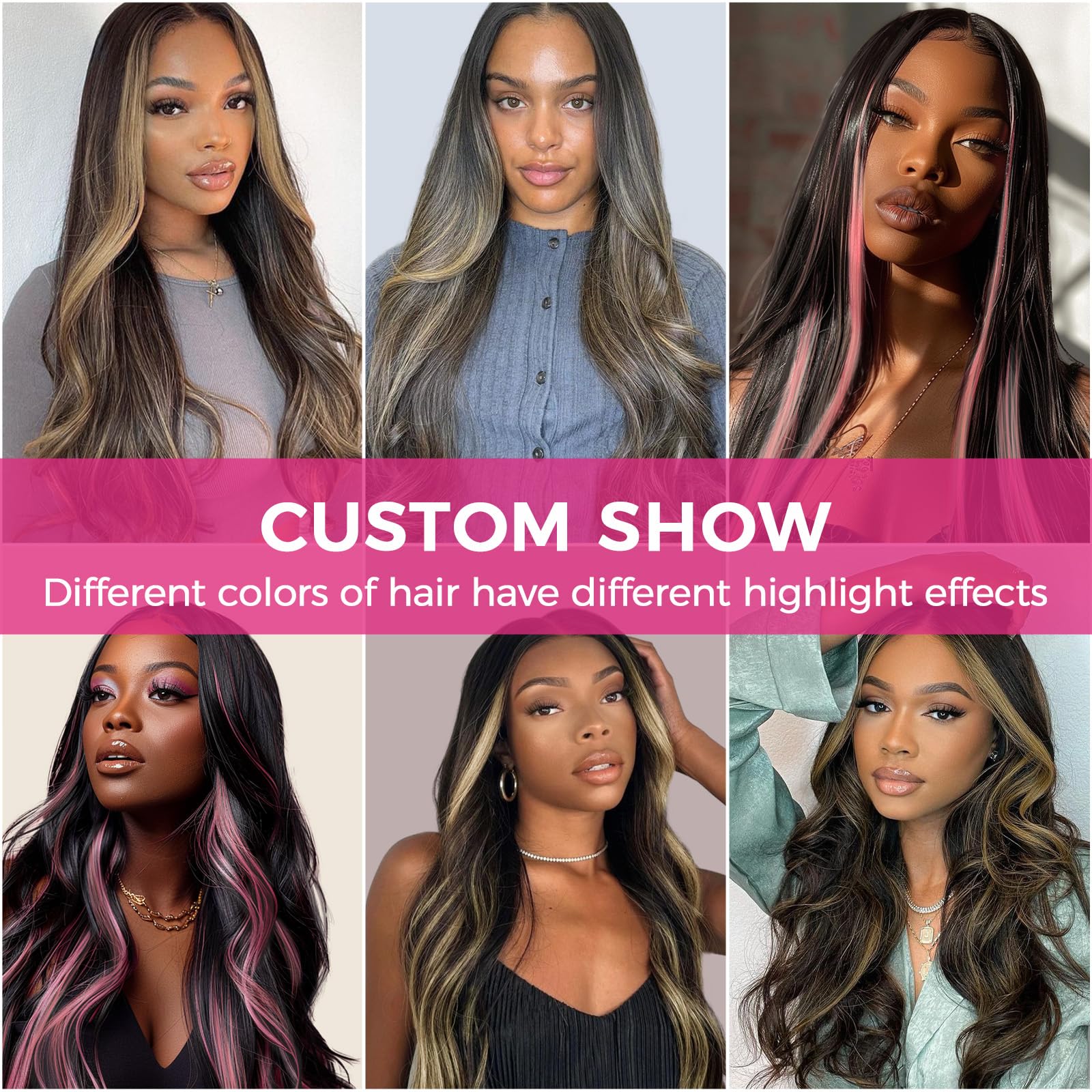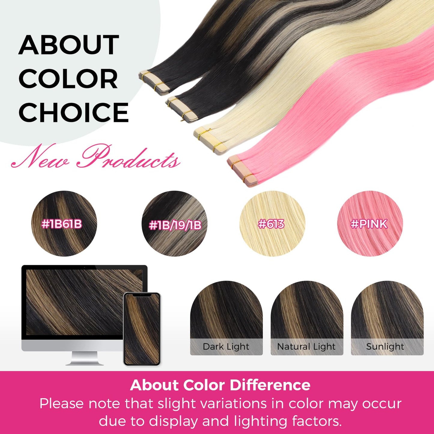 - [Excellent Color Match & Highlighted Effect] Our tape in human hair extensions are designed to match your hair color perfectly, with a natural shine. Black, dark brown, pink, blonde, black mixed chestnut brown and balayage natural black to light blonde are available. According to your needs, make any highlights effect you want You can do as you like strengthened or curled. It's better to do this by professionals, please keep the temperature below 350 Fahrenheit.
