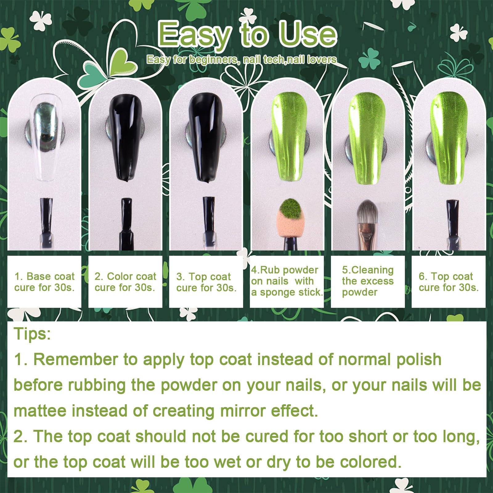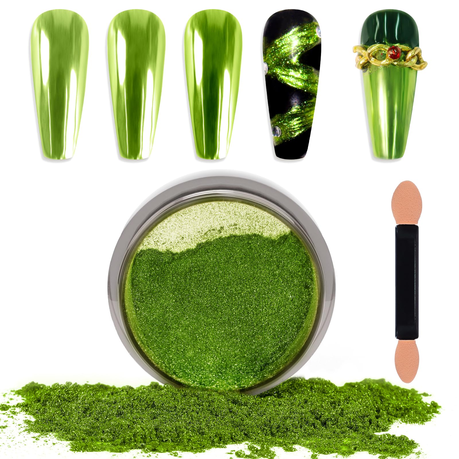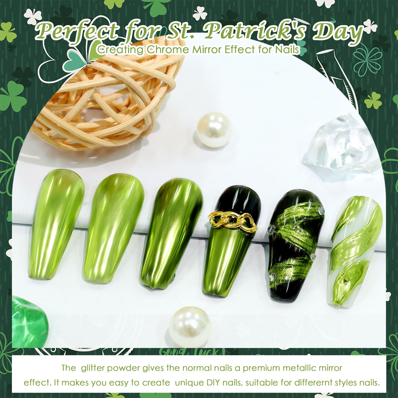 - What You Will Receive: 1 jar of premium chrome powder for St. Patrick's Day nails and a sponge stick (used to apply chrome powder) each package. Each jar contains 1 gram of nail pigment powder for long-time use. And jar was well-sealed to prevent the chrome pigment powder from coming out.