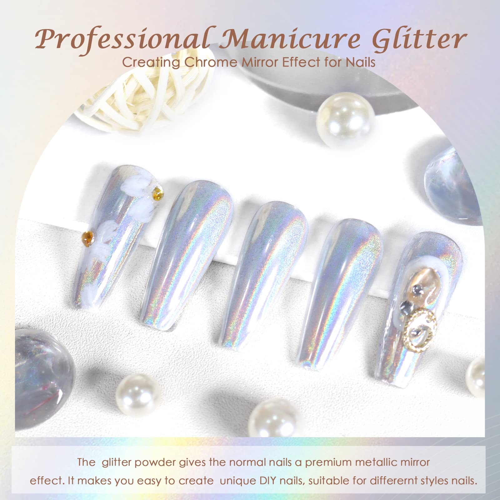 - Wide Application: The laser silver nail chrome powder is suitable to be applied on UV gel nails, acrylic extension and natural nails. It can also perfectly match with chameleon flakes, nail charms, bubble effect, water ripple pattern, French manicure, 3D shell nails and etc. Just unleash your creativity.