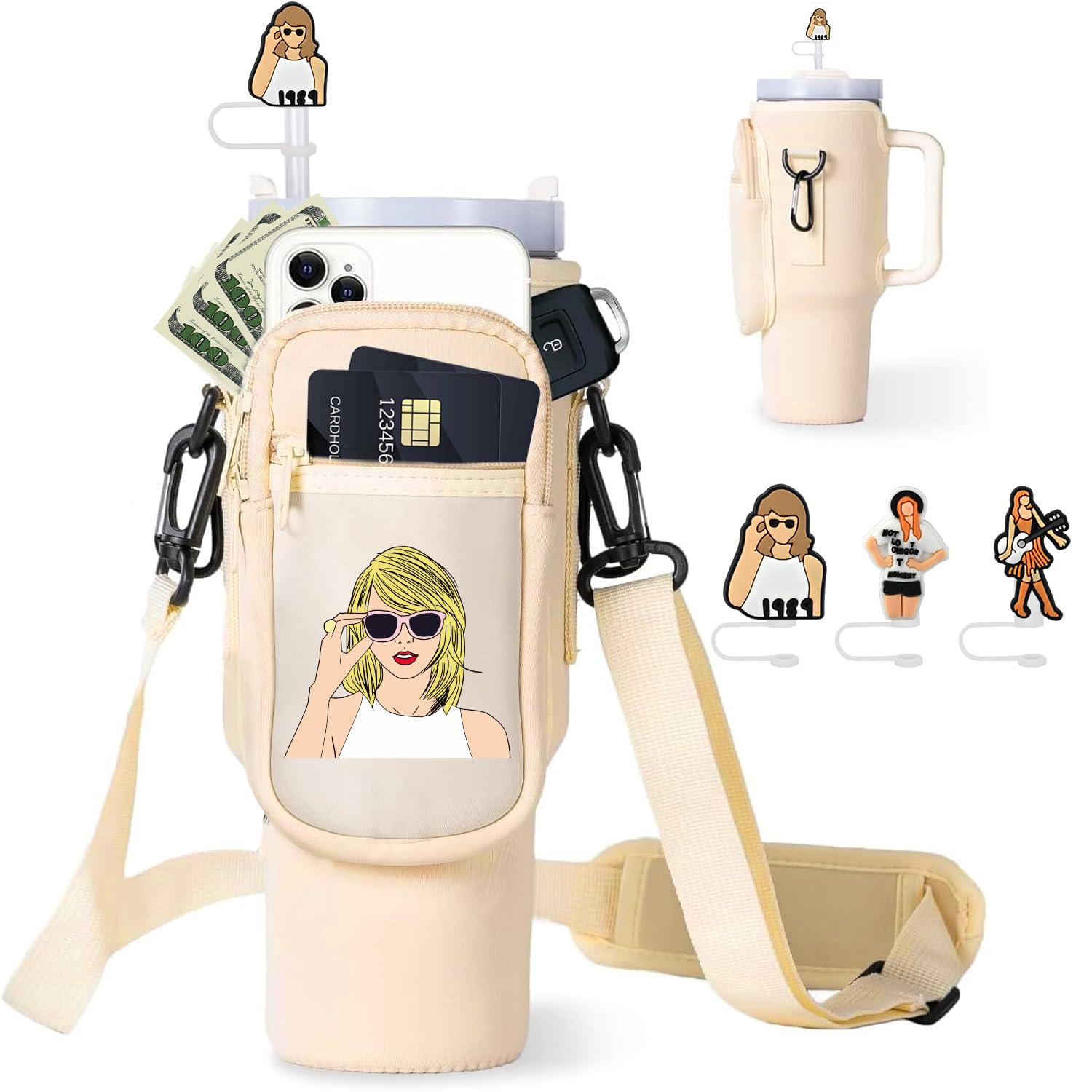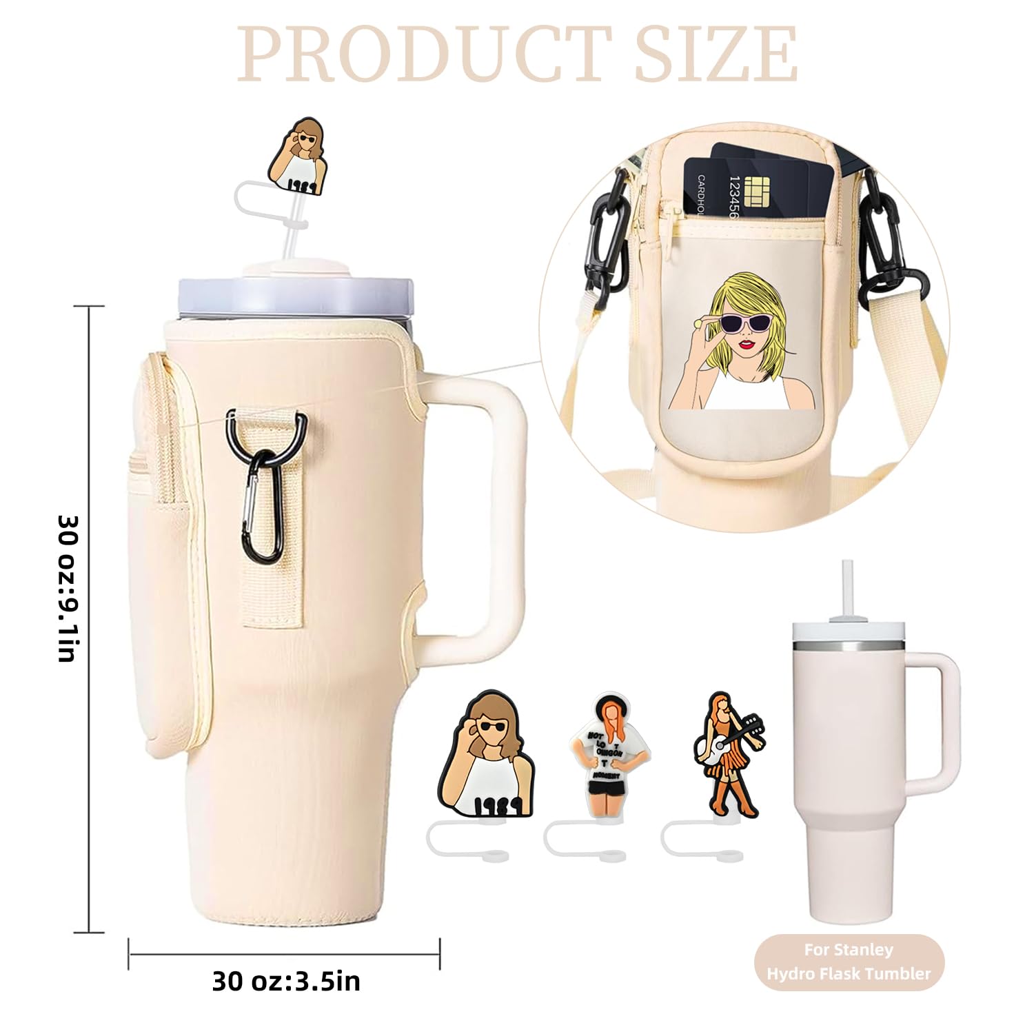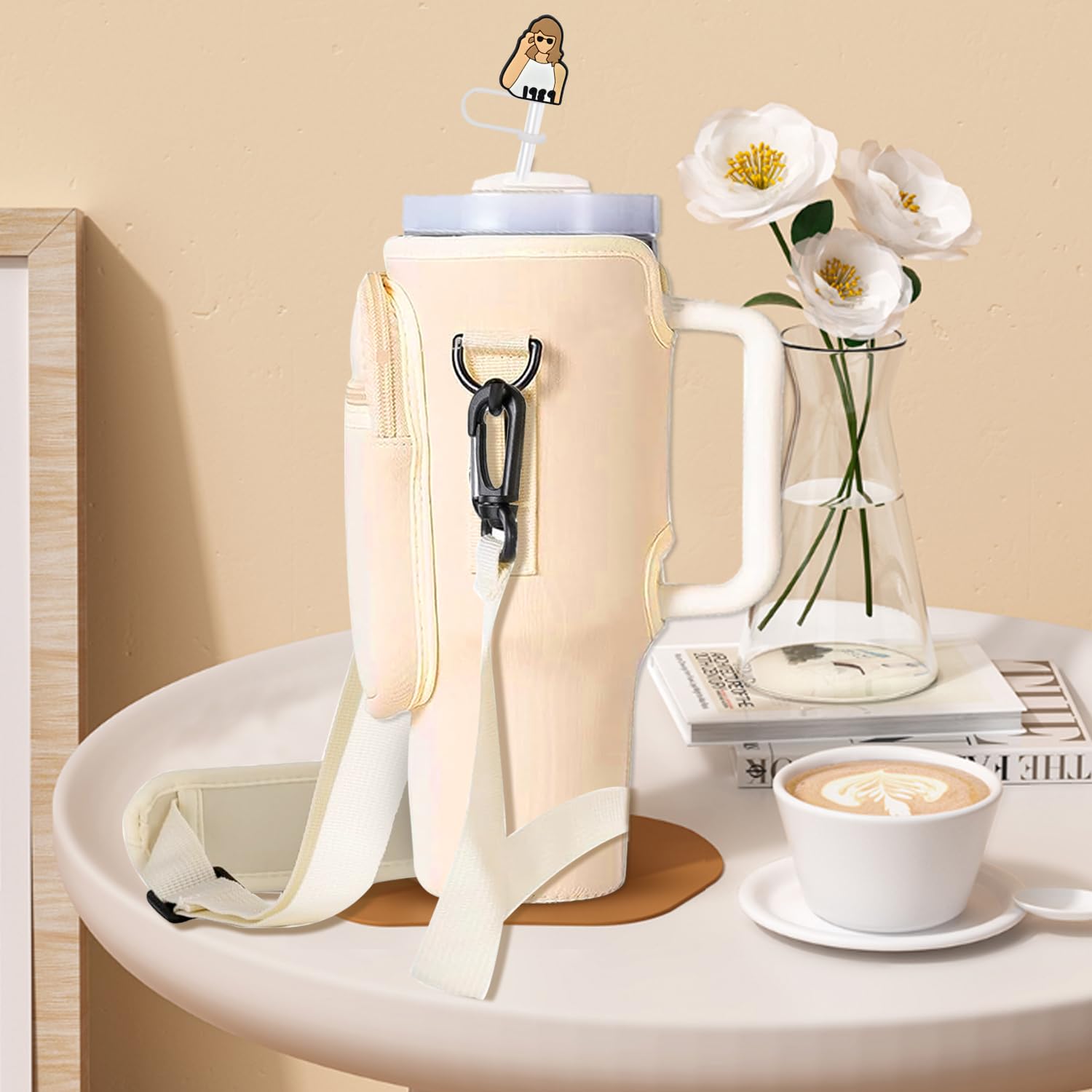 ledytdggu Water Bottle Carrier Bag with Phone Pocket for Stanley 30 oz Tumbler Neoprene Water Bottle Holder Pouch with Adjustable Strap Bollus with Straw Cover & Carabiner for Stanley Cup Accessories