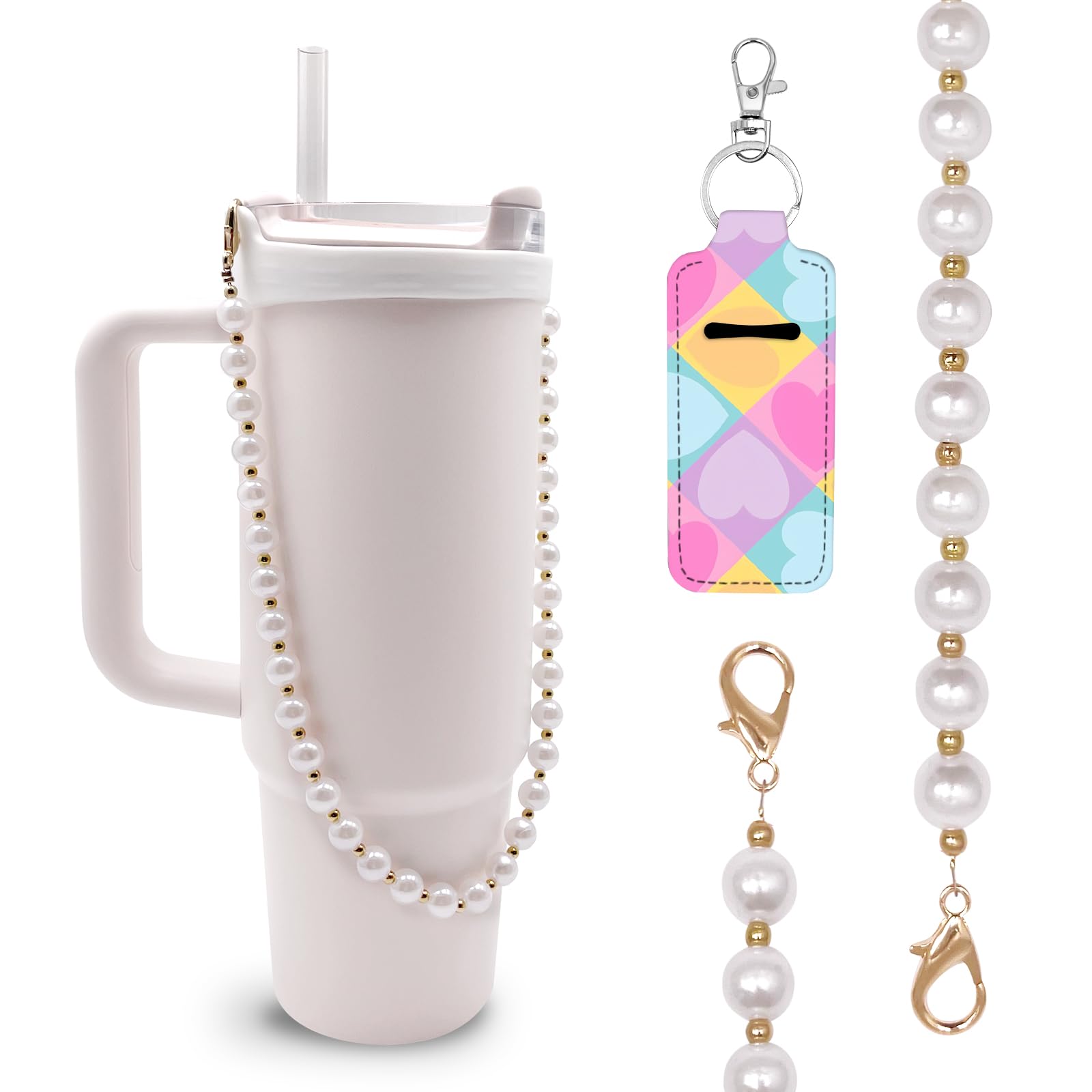 Lingdeer Water Bottle Handle with Lip Balm Holder, Pearl Water Bottle Sling Holder Lanyard, Carrier with Strap, Fits Most 8-40oz Bottles, Compatible with Stanley Cup Accessories