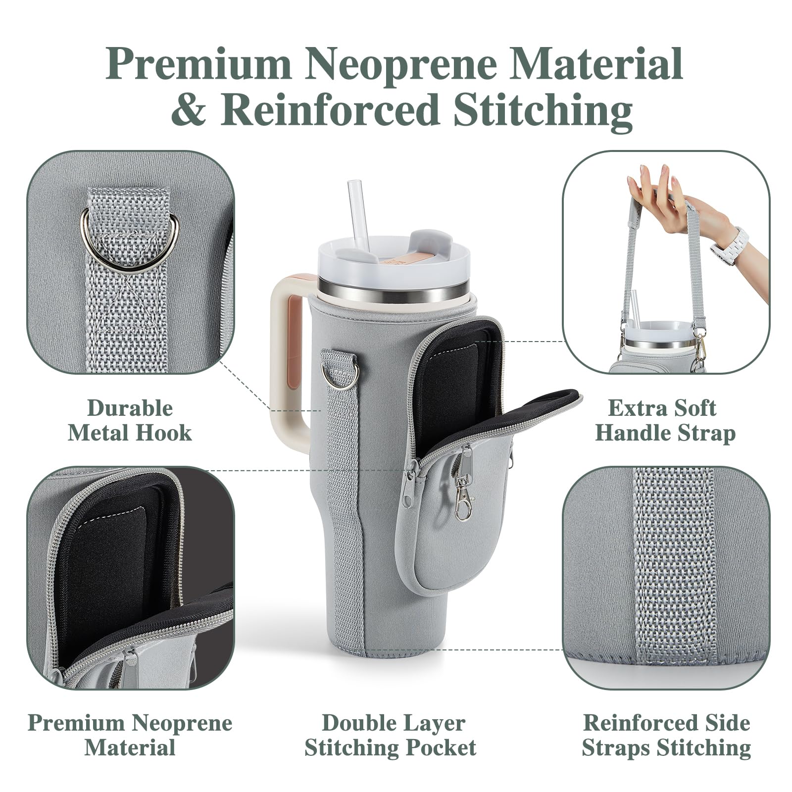 - Premium Neoprene Material & Reinforced Stitching Strap : This Bottle carrier bag for 40/30oz Stanley is made of neoprene material, features soft outer texture, waterproof, shock absorption, protect your Stanley cup from collision, and scratches, Premium Neoprene material enhance the insulation function (whether hot or cold)! Reinforced Stitching Strap will keep the perfect shape of the carrier bag fits your Stanley cup and supports it more durable and stable when you hang out, easier to carry.