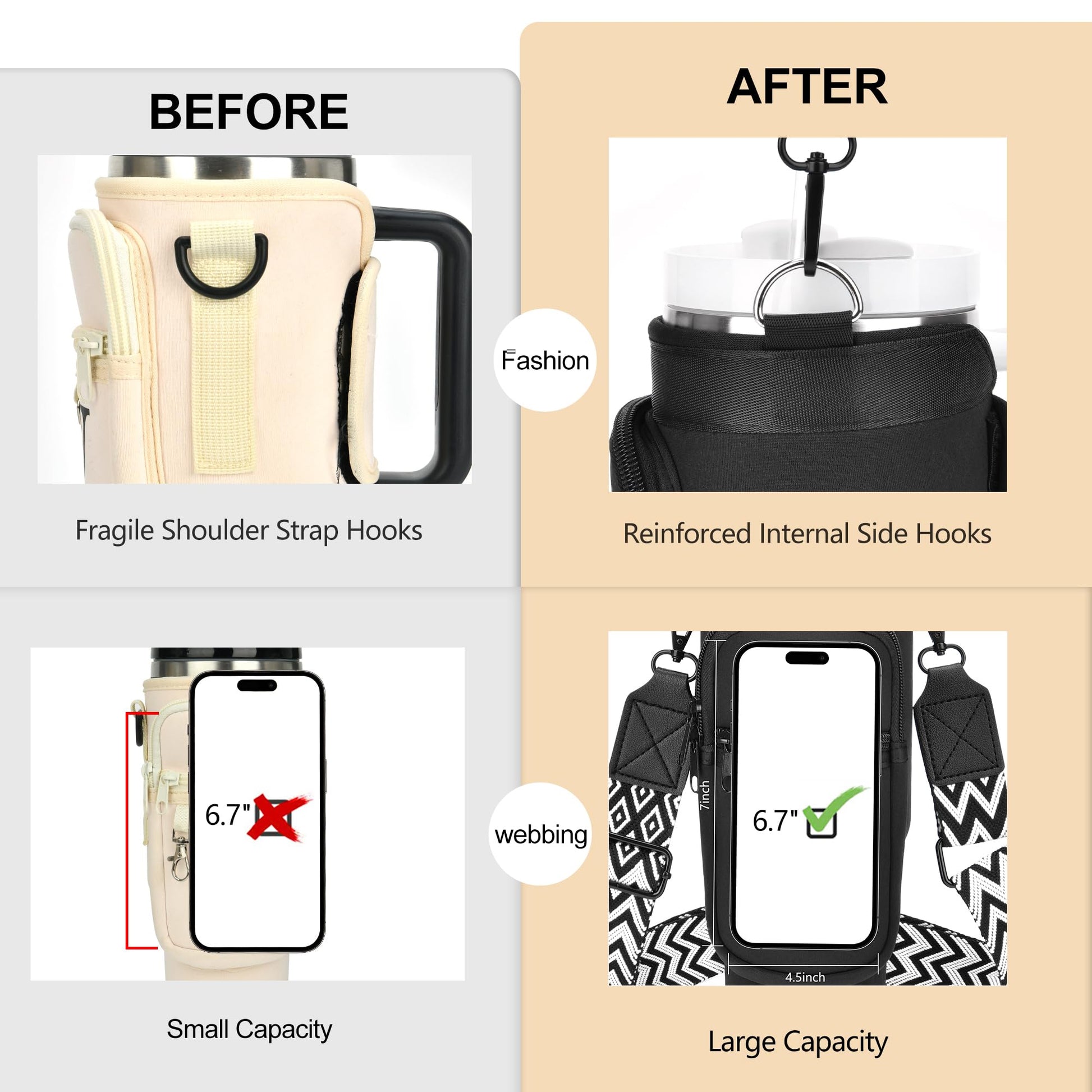 - 【Reinforced hook webbing】: Increases the durability of the water bottle hooks and hides the seams on the side of the bag, making the water bottle carrier more fashionable. The design of the hook position is ergonomic, which solves the problem of discomfort when wearing.