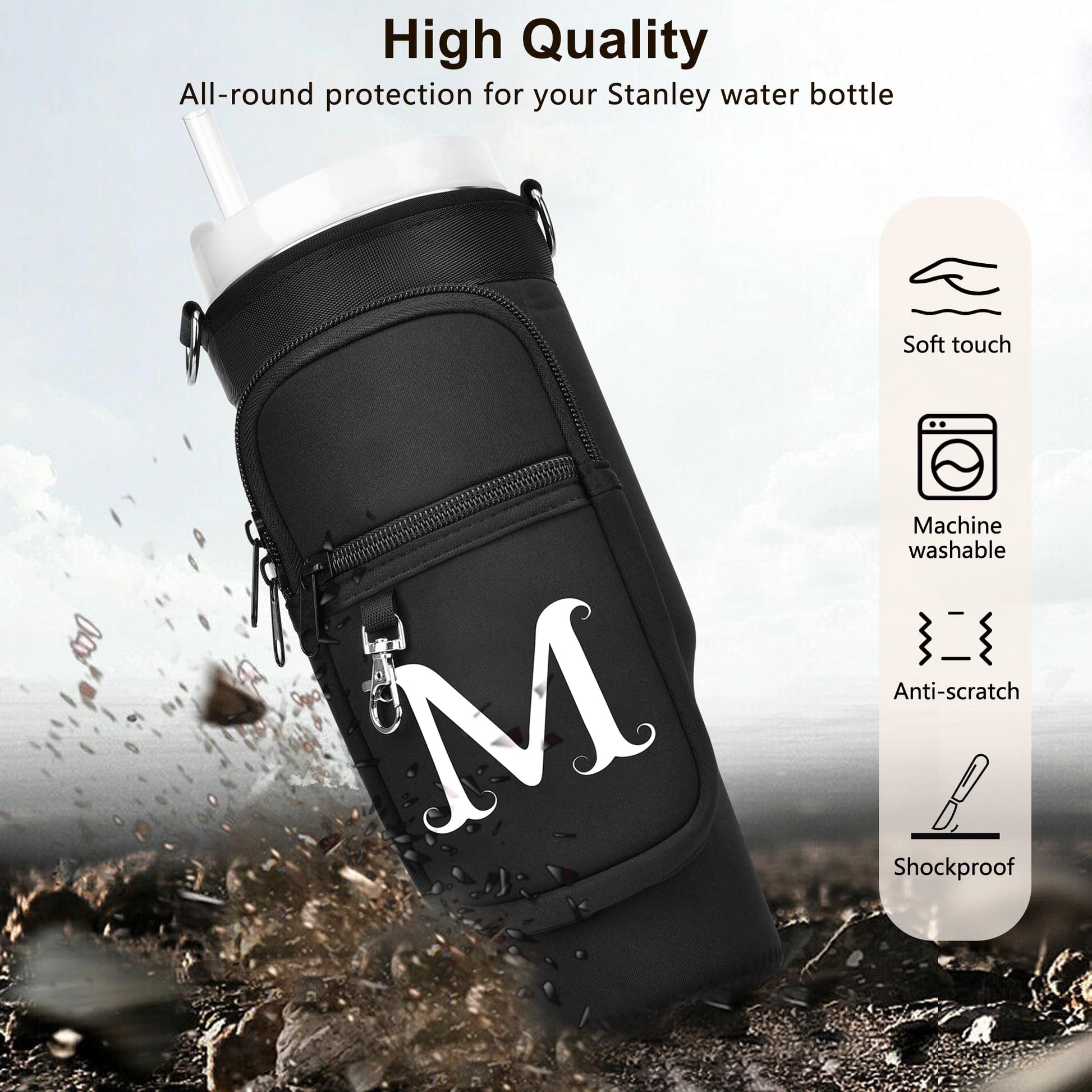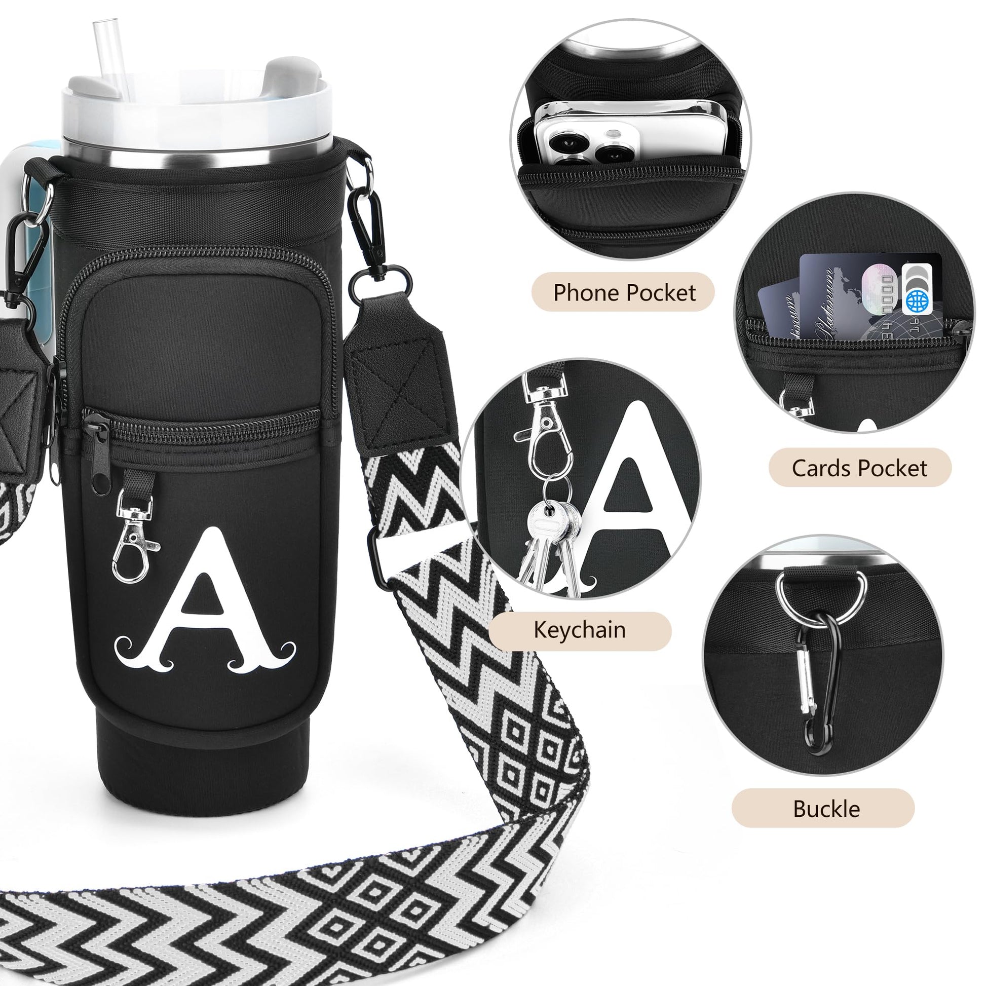 LOKASS Initial Water Bottle Holder with Upgrade Canvas Strap for Stanley 30 oz Tumbler, Gift for Mom Mother's Day Day gifts with Phone Pocket, Personalized Accessories for Stanley Cup, Black - L