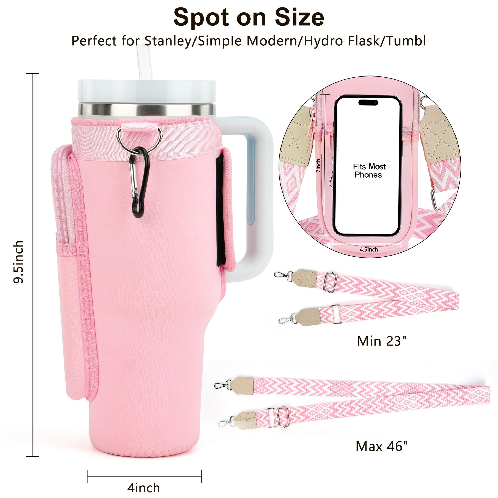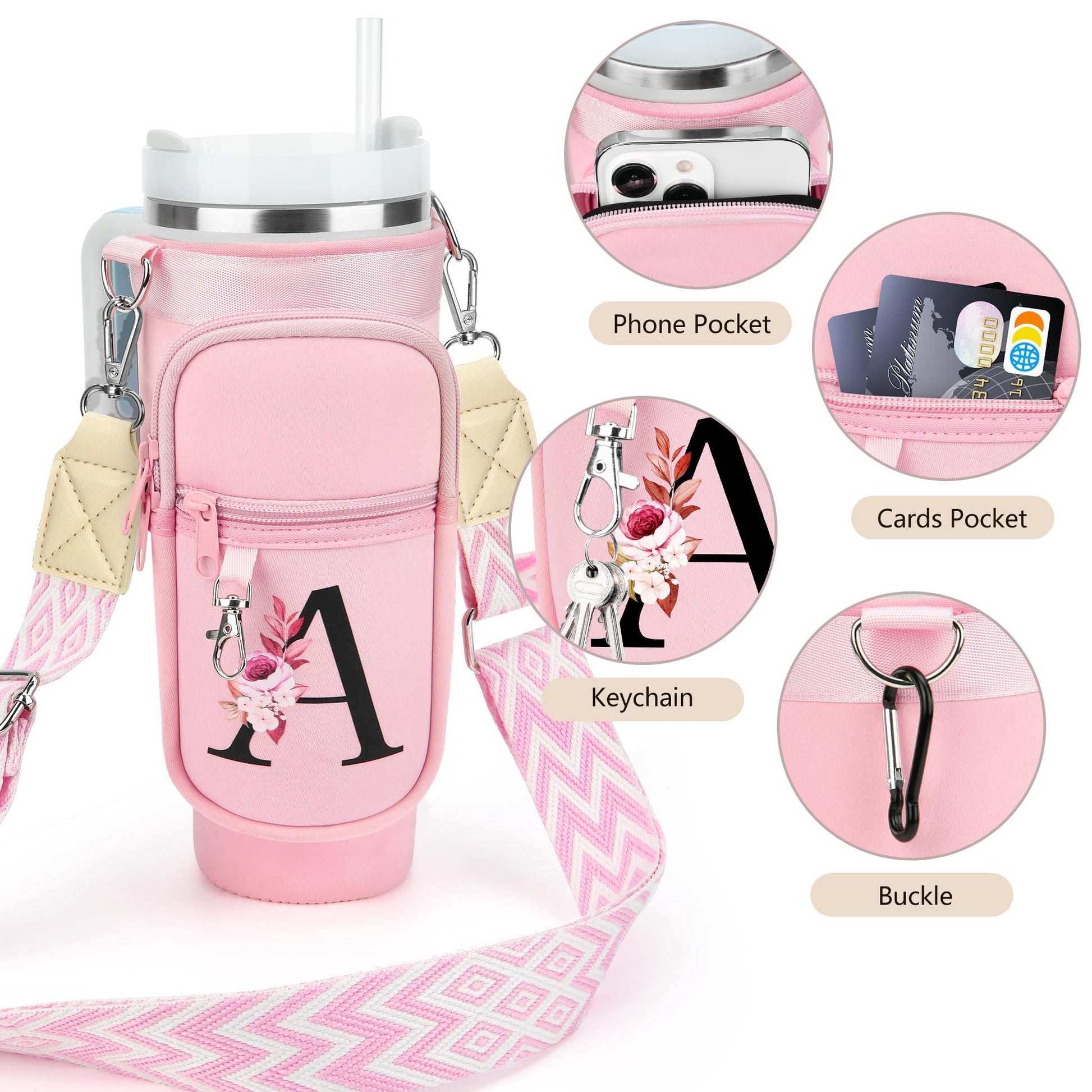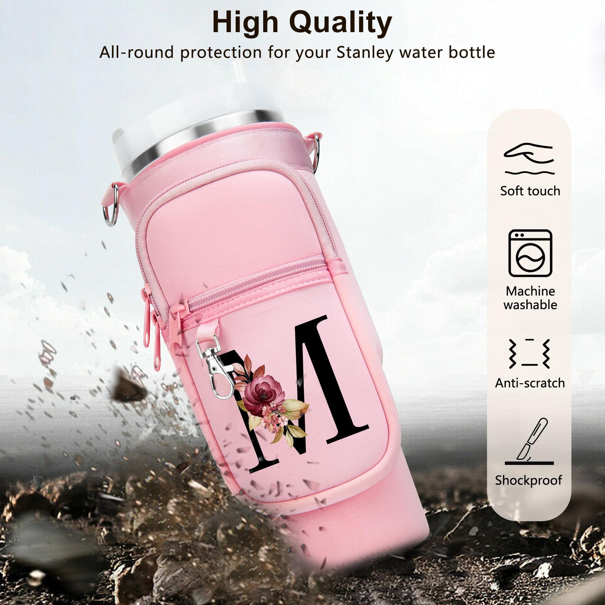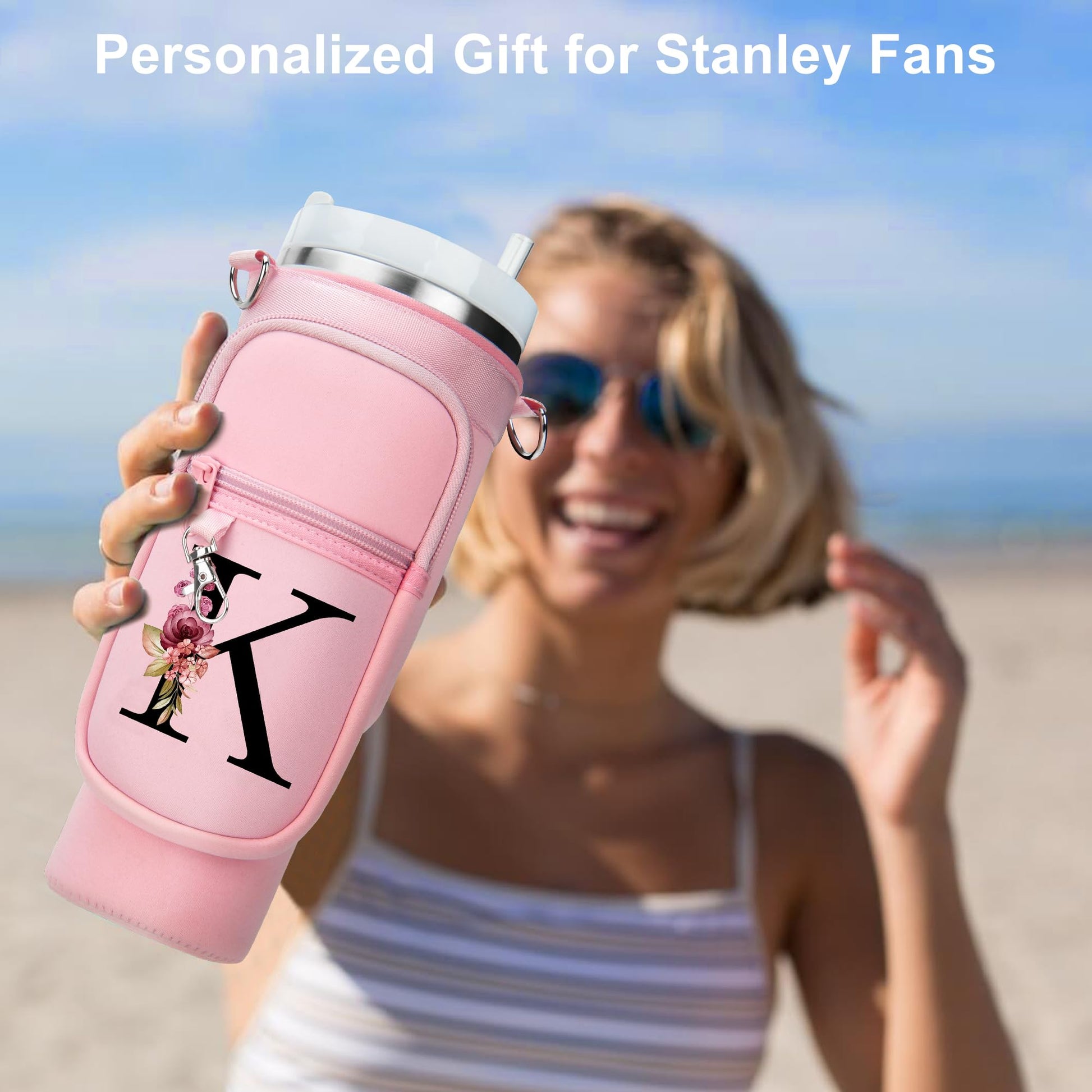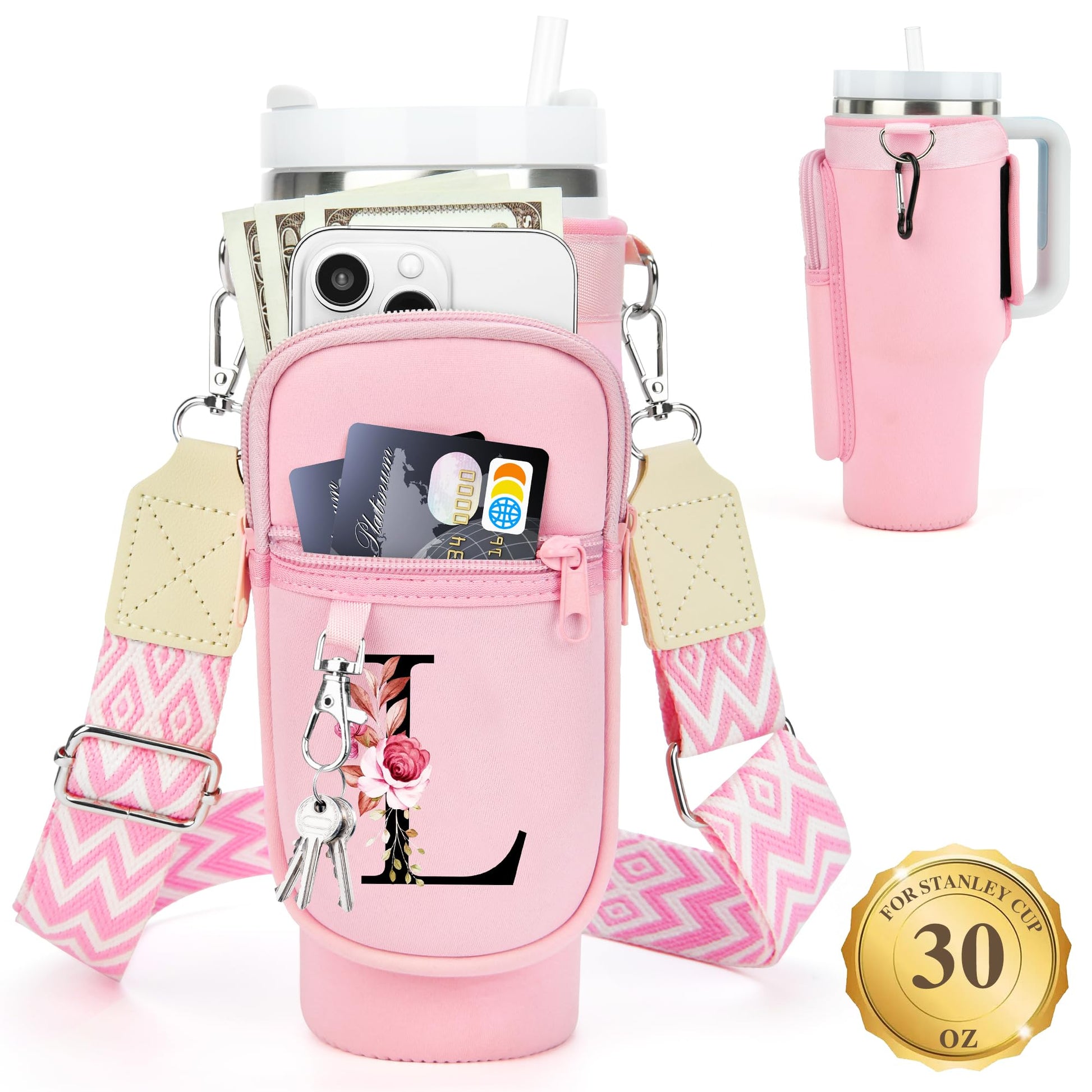 LOKASS Initial Water Bottle Holder with Upgrade Canvas Strap for Stanley 30 oz Tumbler, Gift for Mom Mother's Day Day gifts with Phone Pocket, Personalized Accessories for Stanley Cup, Pink - L