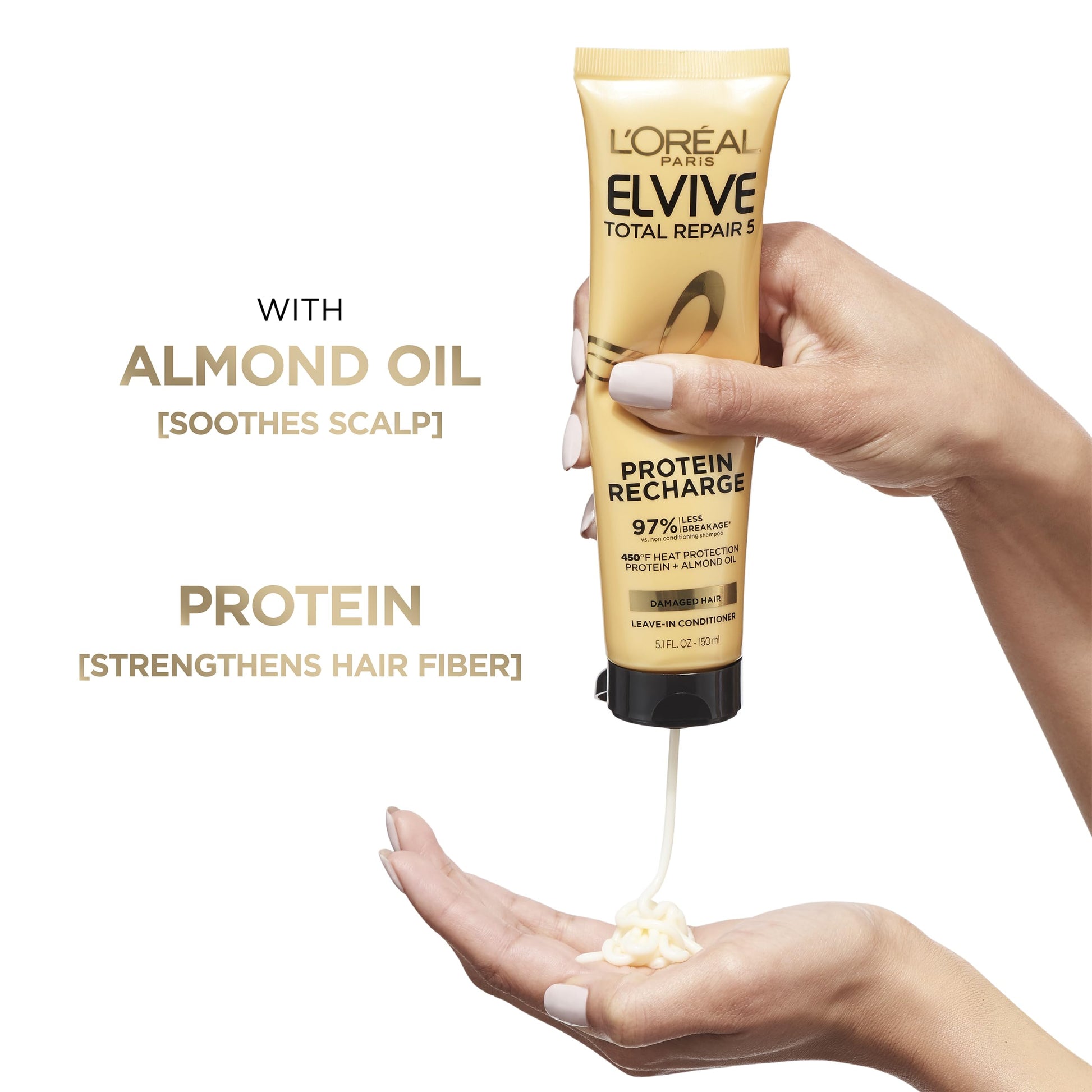 - Hair Protein Treatment with Heat Protectant: L'Oreal Paris Elvive Total Repair 5 Protein Recharge leave in conditioner is formulated for stronger, smoother, healthy hair. Boosts hair strength, flexibility, and protects against damage and breakage
