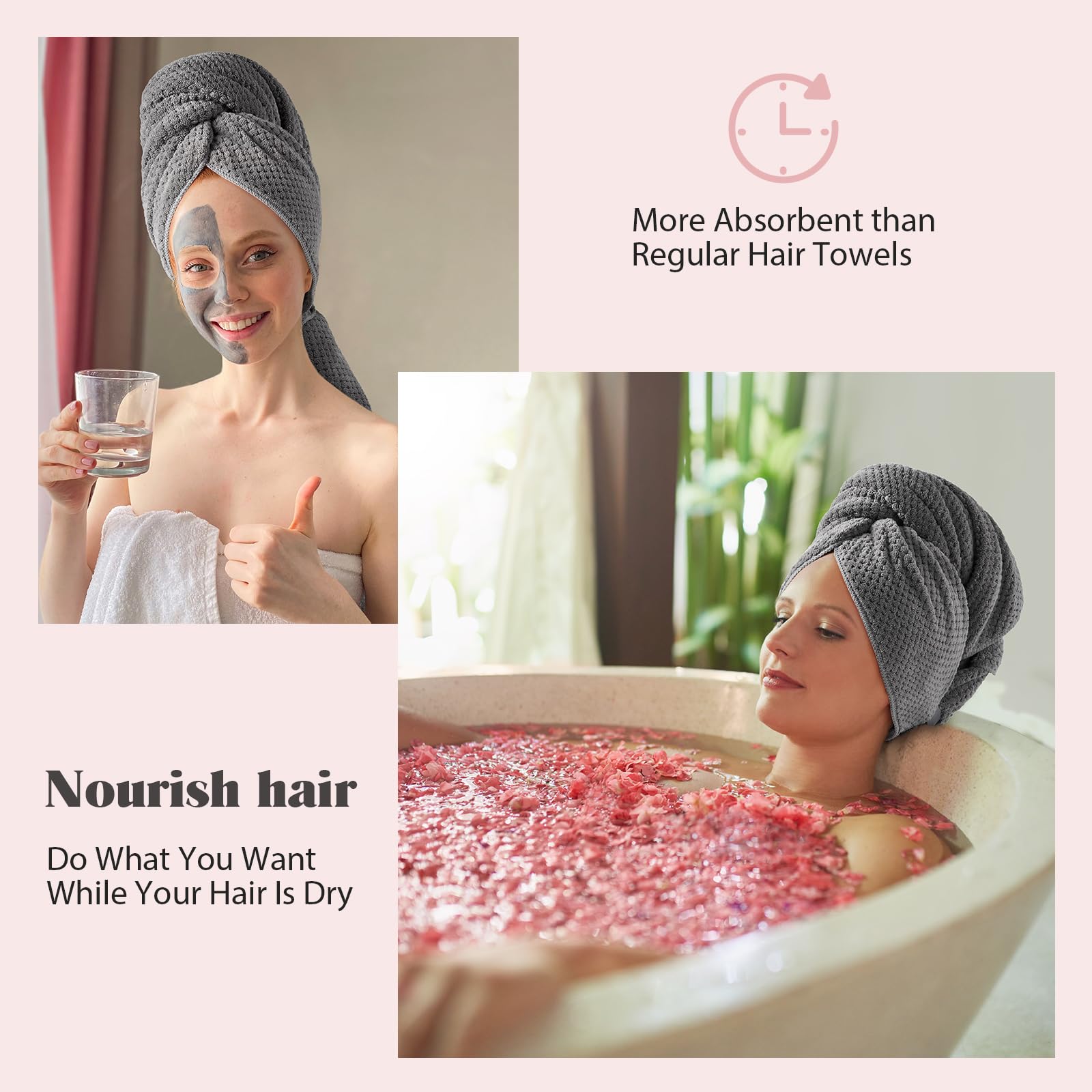 - Won't Fall Off with Elastic Band: The elastic band is firmly stitched on hair towel wrap for women and stays on your head. You can take care of your skin, and do what you want while your hair is dry without worrying about the hair towel slipping off, making it easy to complete your hair care.
