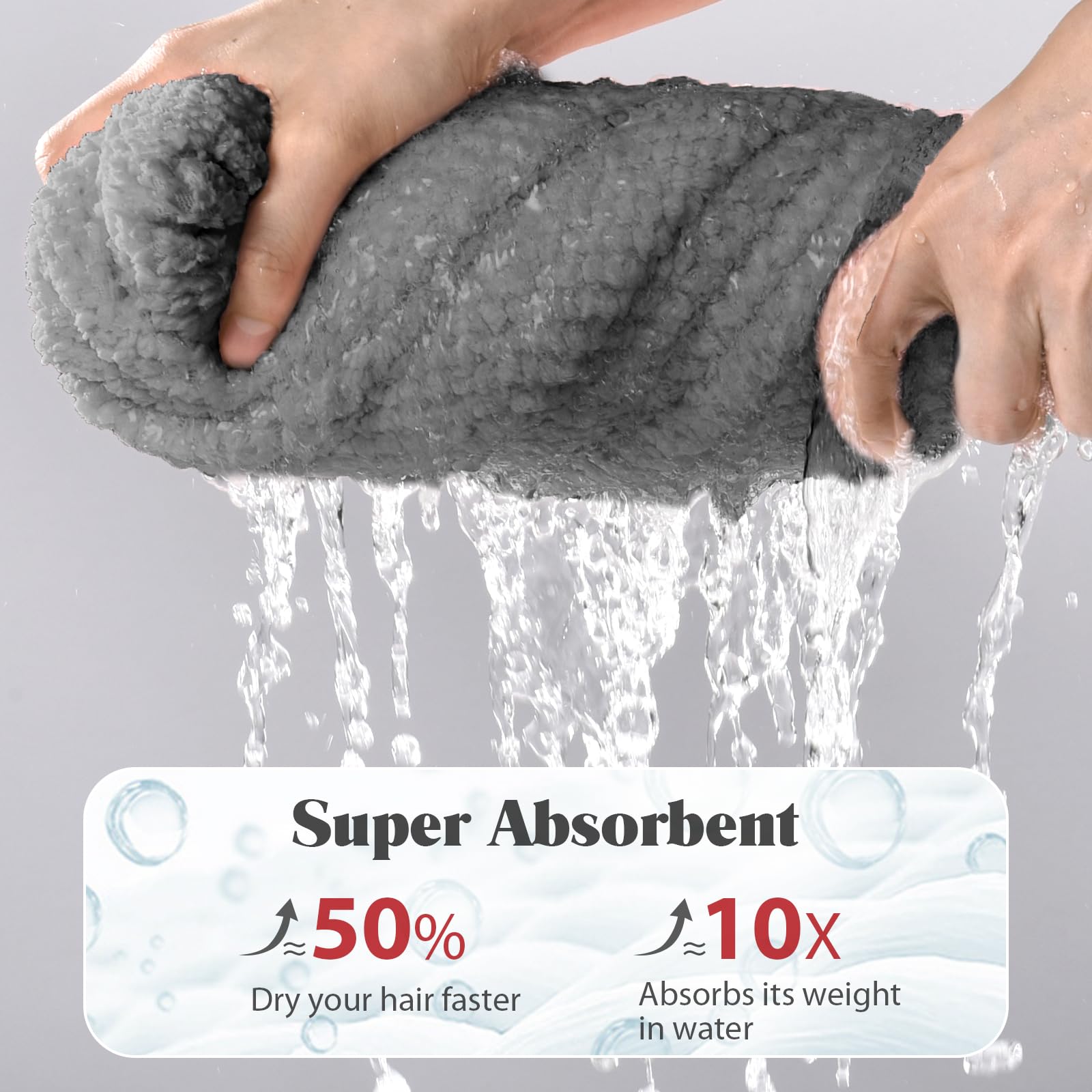 - Dry Your Hair Faster: The MABAO microfiber hair towels are made of super absorbent microfiber material that is soft to the touch and dries hair quickly. The luxurious fabric can absorb 18x its weight in water and reduces dry time by 60% by removing more water than other hair towels.