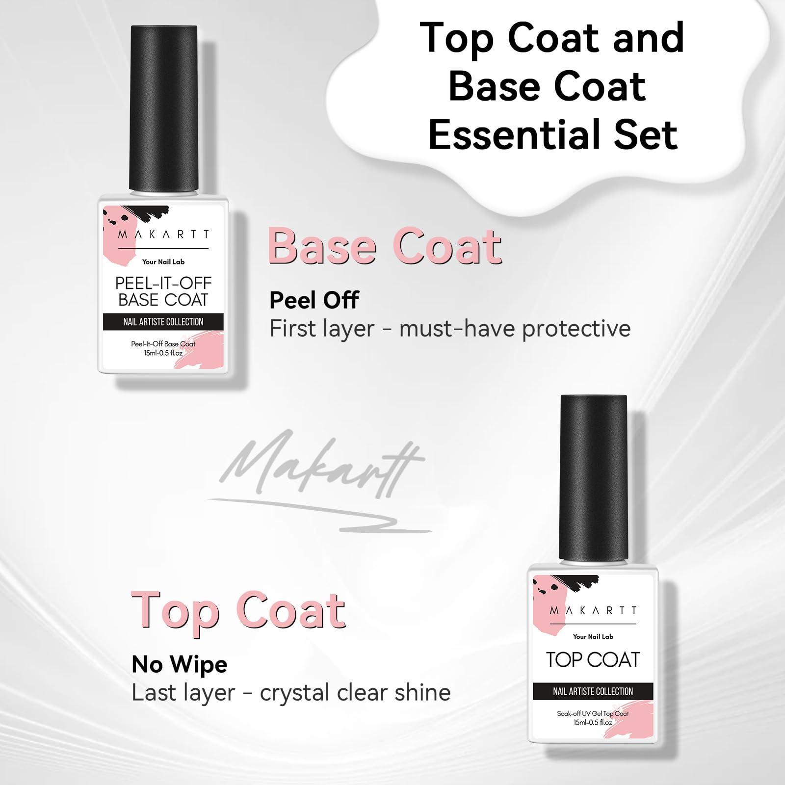 - 【No Wipe Gel Base and Top Coat】You will get 1*15ml peel-off Base Coat+1*15ml Top Coat.Makartt new gel base coat allows you to peel off your gel polish manicure without damage to the natural nail.It can be used with all brands of gel nail polish.