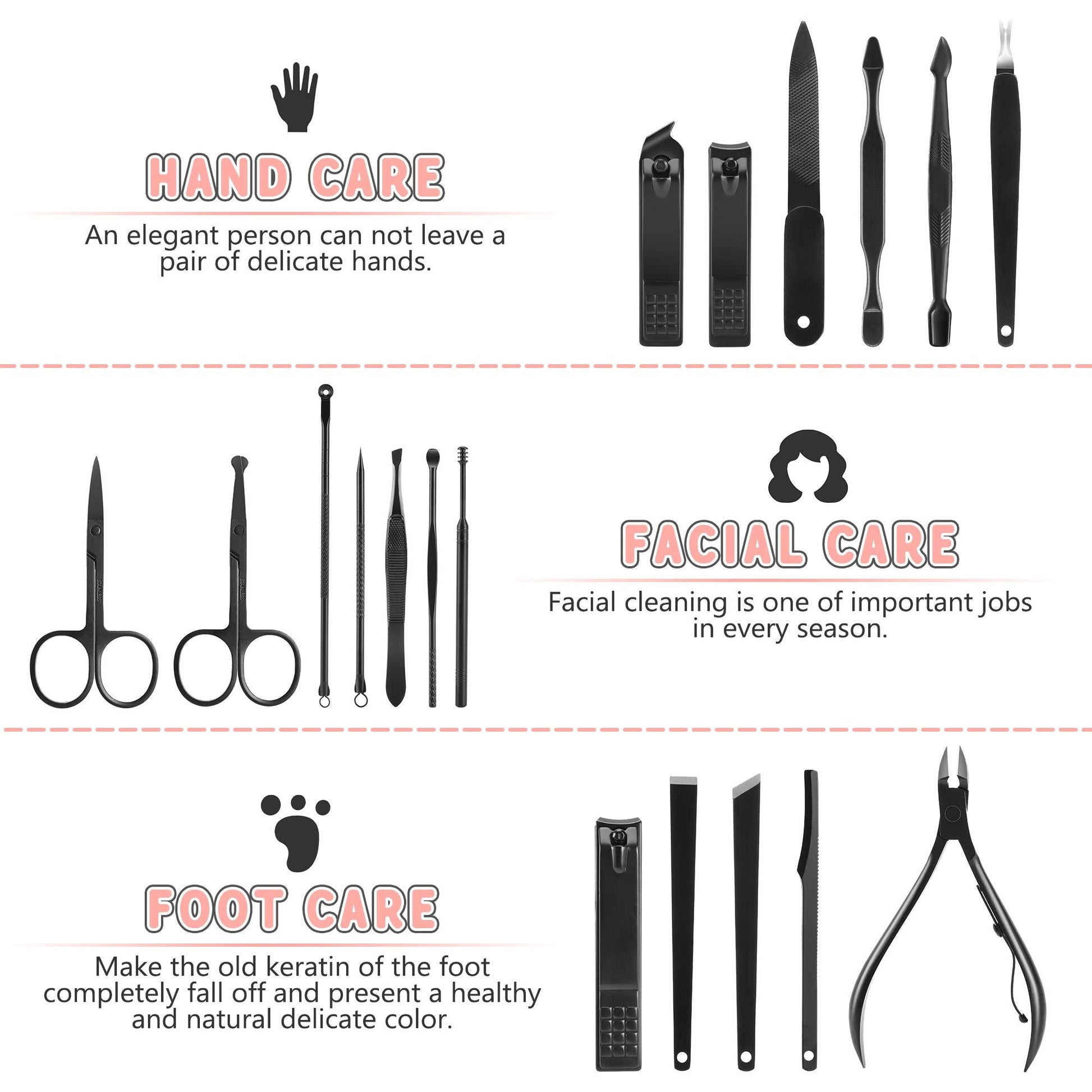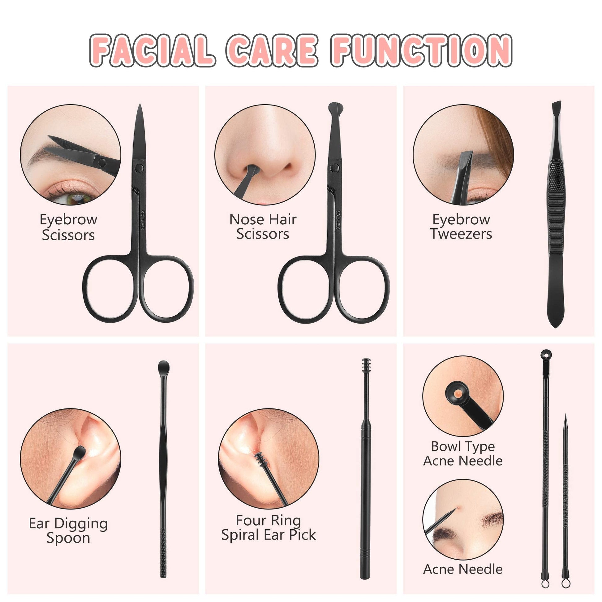 - ✅ 19 in 1 Multi-Functional Manicure Set - Jubolion Professional Manicure Kit contains 19 tools for Three Function (hand care, facial care, foot care) and Multiple Uses (manicuring, pedicuring, eyebrow shaping, anti-acne, exfoliating etc.). It can meet all of you needs, suitable for women, men, girls, boys and seniors.
