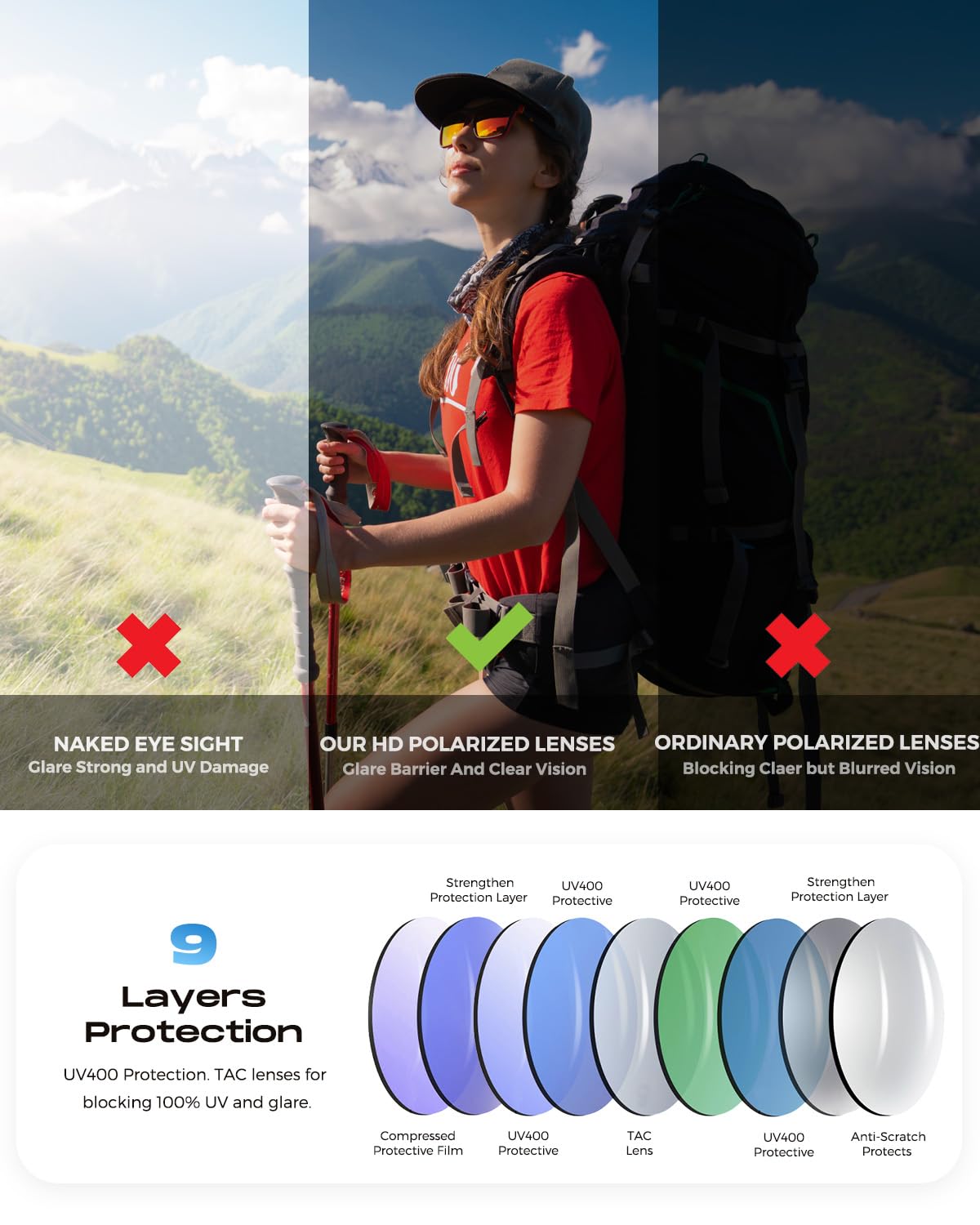 - Passing Double Decentering Test TAC Lenses โ Polarized lenses shield with 9 Layers protection only 1.0mm thickness,ensure no optical distortion,help reduce glare caused by reflected light, more comfortable and clearable.