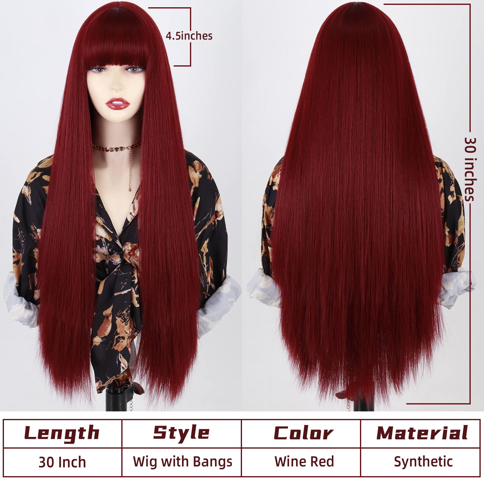 MISSQUEEN Long Red Wig with Bangs,Straight Dark Red Wigs for Women,Wine Red Long Straight Heat Resistant Synthetic wig for Fashion Women