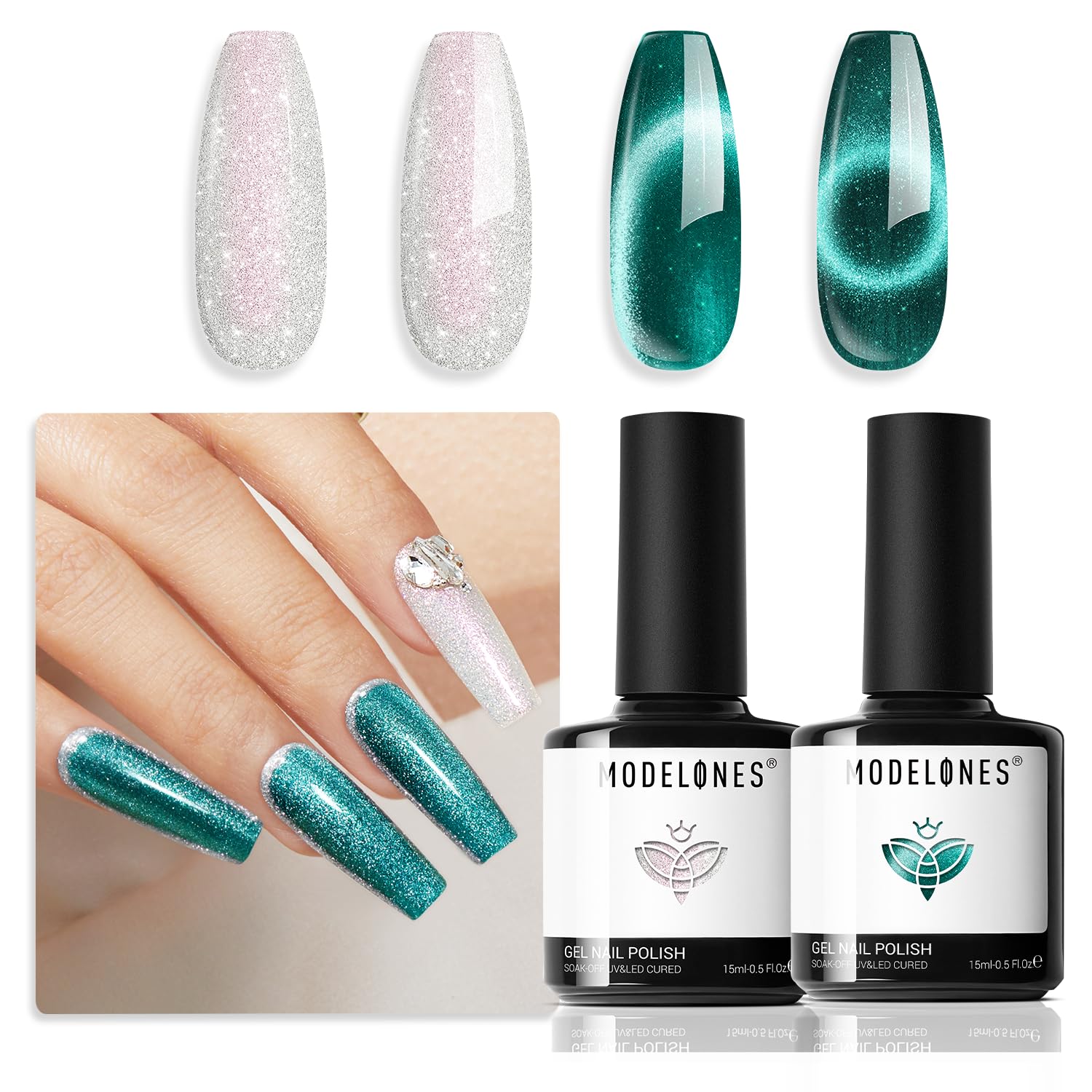 - 2025 Modelones Trendy Color: Unveil the all-new White Green Cat Eye Gel Nail Polish by Modelones! Each carefully selected shade is designed to enhance your style for any season, occasion, or outfit. Infused with dazzling metallic magnetic glitter, our 9D Cat Eye Gel Polish delivers a mesmerizing, high-gloss finish, turning your nails into a stunning work of art.