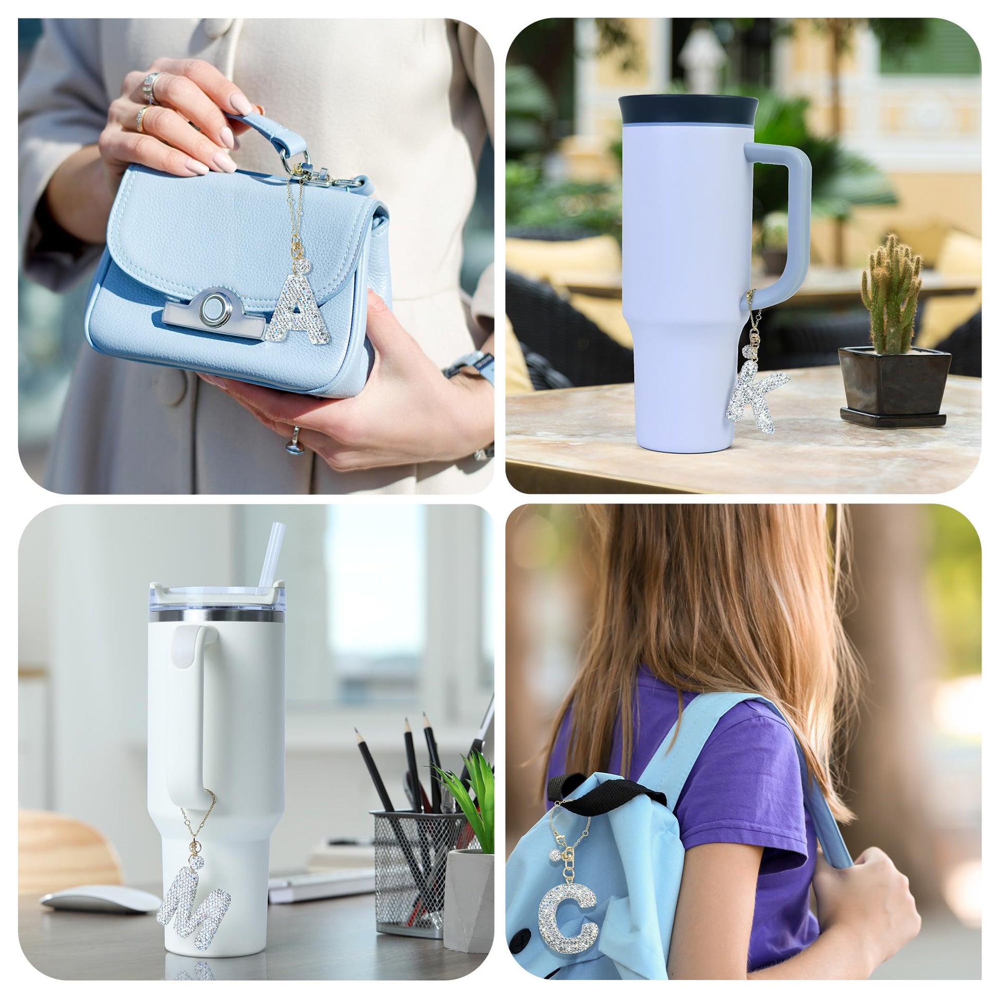 - ✨【Bling Letter】 Iridescence glittering initial letter design. The surface of each letter charms are designed with rhinestones, shining brightly, flip the charm can get a sparkling feeling under the light. A unique mark for your Stanley Cup and other water bottles/tumblers with handles.