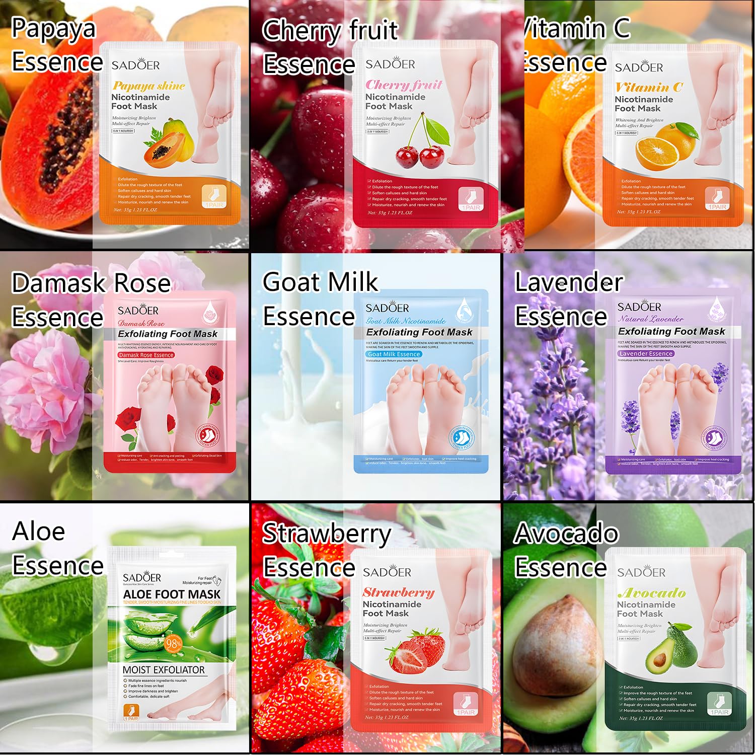 - 9 Scent Moisturizing Foot Mask Bulk: This foot peel mask is rich in strawberry extract, Papayаa essence extract, Cherry fruit essence extract, Vitamin C essence extract, Damask Rose essence extract, Goat Milk essence extract, Lavender essence extract, Aloe essence extract, Avocado essence extract, hyaluronate and other ingredients, which are known to deeply moisturize and restore the skin; These hydrating foot masks for dry cracked feet soften, soothe and restore the skin, leaving you with silky smooth and refreshed feet; You can expect softened and rejuvenated skin after use