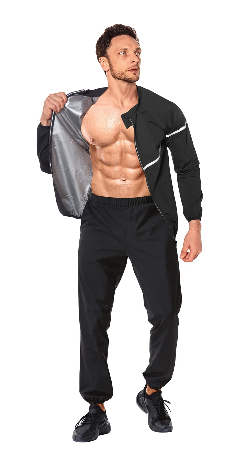- Workout Jacket for Men Features: Lock in sweat, the silver sauna suit use durable fabric, sealed zipper, cuffs and bottom closure design provide windproof function, accumulate body and avoid sweat infiltrate, do not let small rain disturb your from workout. And workout sweat suits uses a heat-trapping polymer fabric to boost your natural body heat and stimulate sweating with any type of physical activity.
