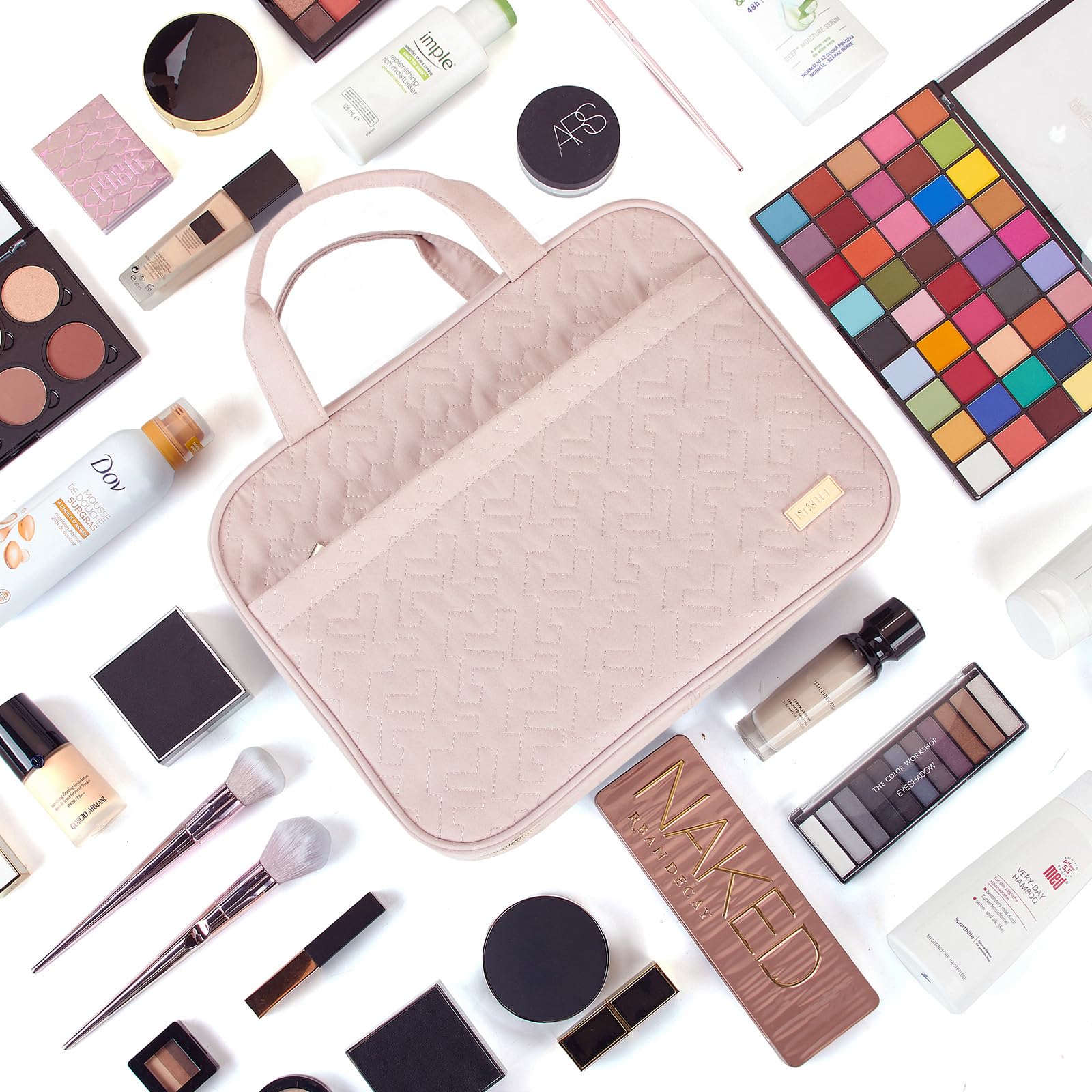 NISHEL Travel Toiletry Bag for women, Portable Hanging Organizer for Full-Sized Shampoo, Conditioner, Brushes Set, Makeup Accessories, Large Size, Pink