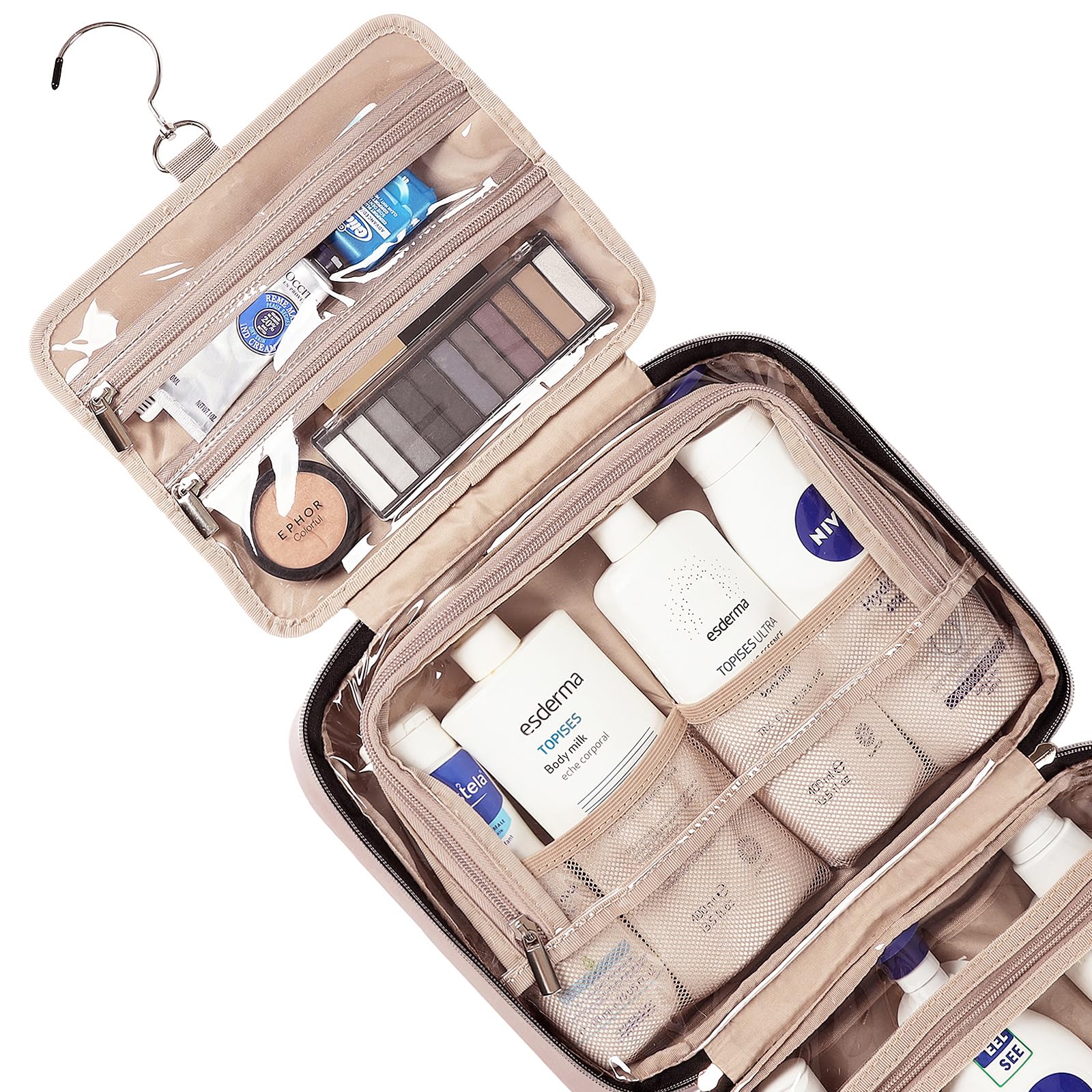 - ESSENTIAL ARRANGEMENT - A hanger to hook allows you to hang the toiletry bag almost anywhere for easy accessibility. Quick-access front pocket for secure storage