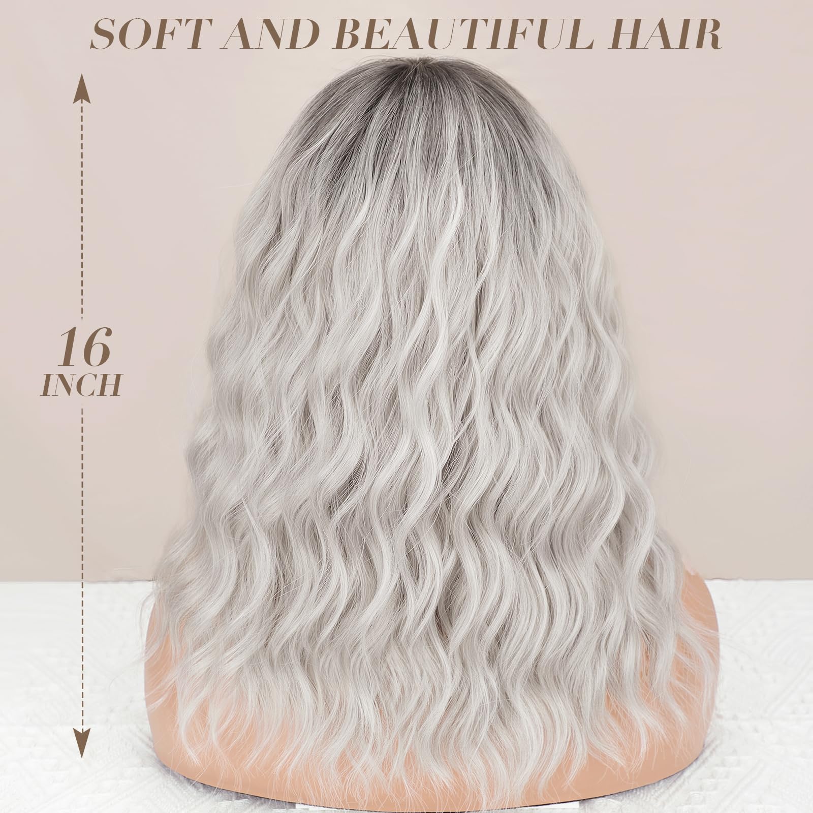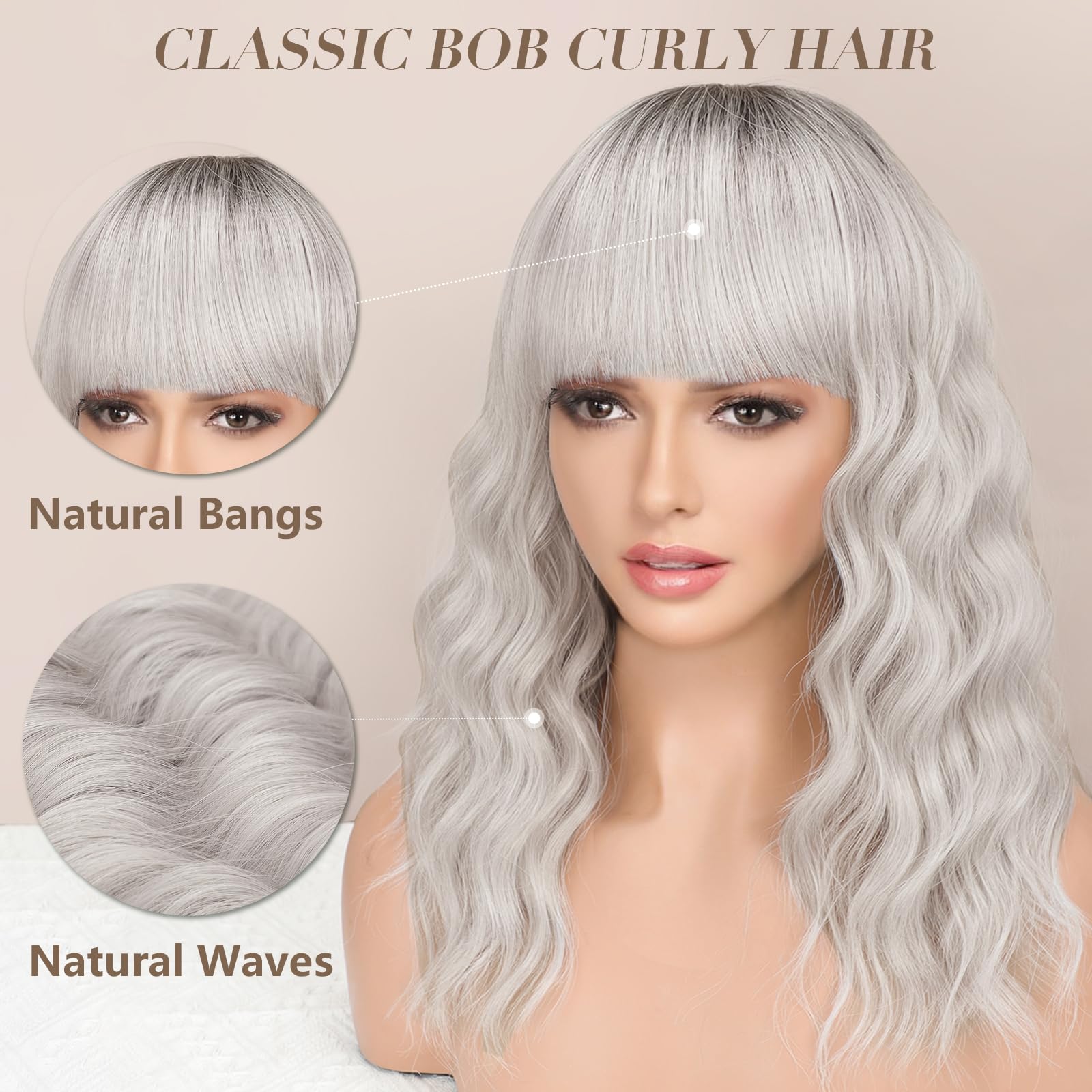 Nnzes Ombre Silver Wig with Bangs for Women White Bob Wavy Charming Synthetic Wigs with Natural Shoulder Length Curly Heat Resistant Hair for Daily Party Use