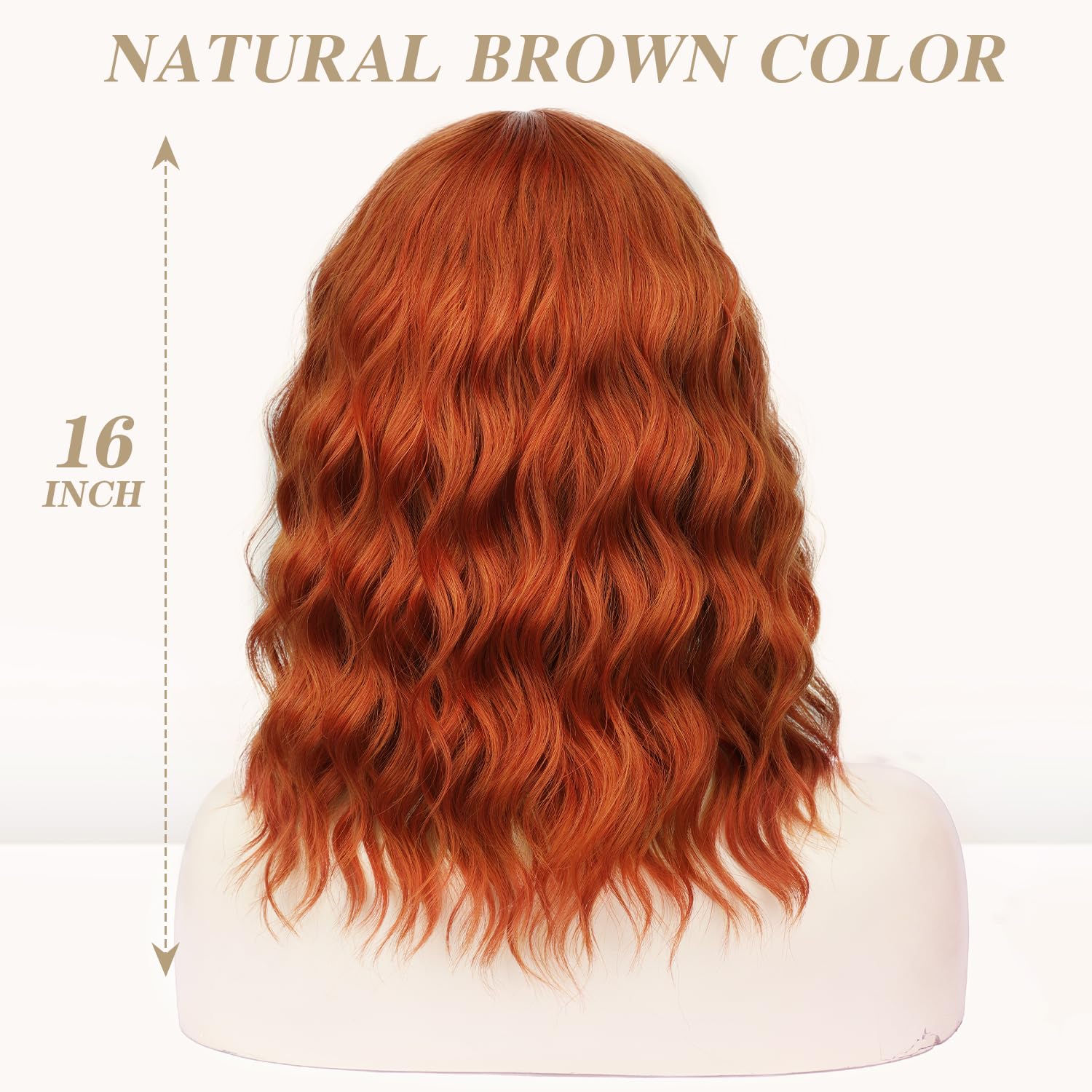 Nnzes Short Orange red Wavy Wig with Bangs for Women Shoulder Length Bob Curly Women's Charming Synthetic Wigs with Natural Wavy Wig Heat Resistant Hair for Daily Party Use