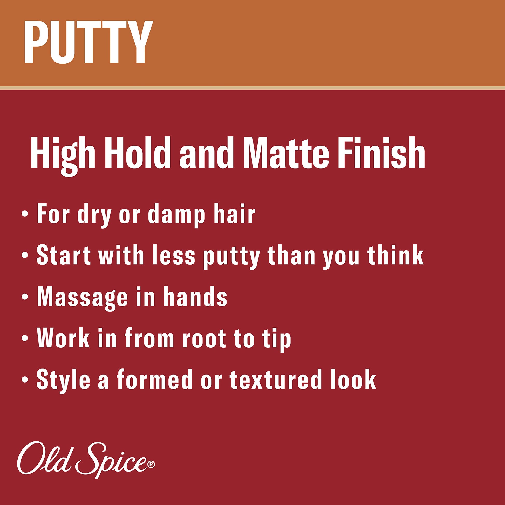 Details: Lock your look in place with Old Spice Styling Putty. It's made for the hair of man and won't let you or your 'do down. Rub a small amount between your fingers and work it through damp or dry hair. Its high hold and matte finish work particularly well for short hair and spikier styles, like the forever fan-favorite the faux hawk. Show off your manliest side when your throw off major vacation vibes with the fresh scent of coconut and tropical wood. While you're breathing in the tropical air, you can feel 100% confident that you are looking 100% mansome. That's because Old Spice hair styling products for men are inspired by barbers and crafted for barbershop-quality results.