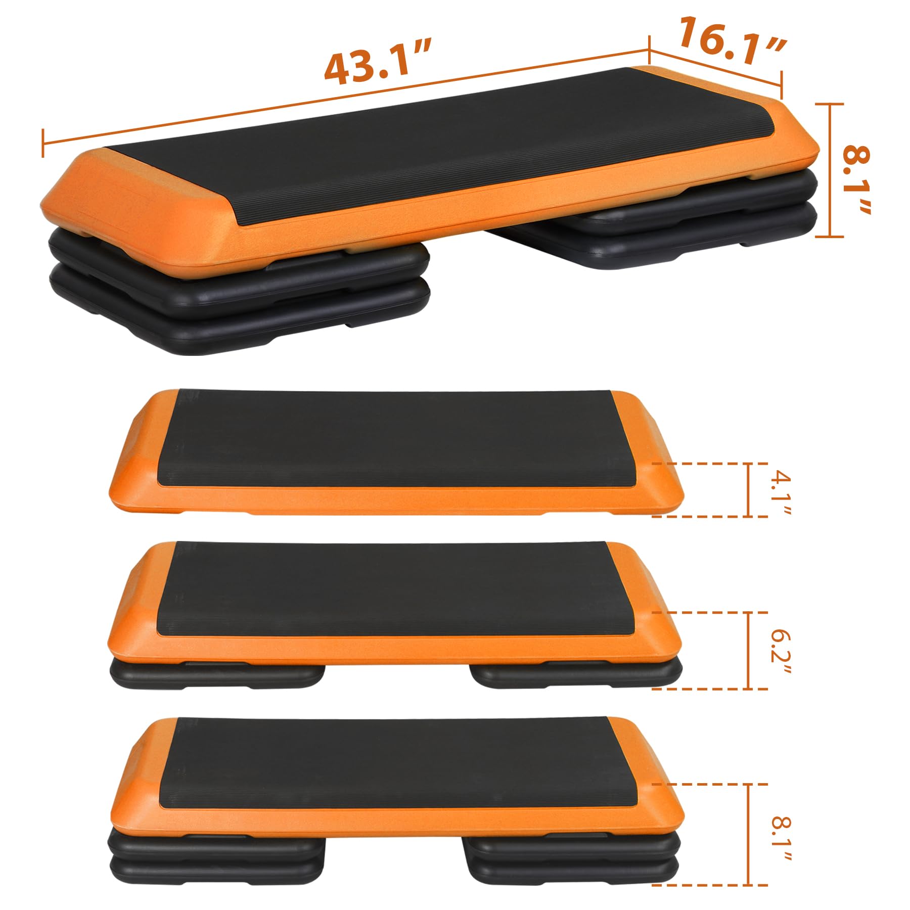 Oteymart 43'' Exercise Step Platform 3 Levels Adjustable Aerobic Stepper with 4 Extra Risers and Anti Slip Surface, Training Workout Equipment for Home&Gym Cardio Strength & Training, Orange