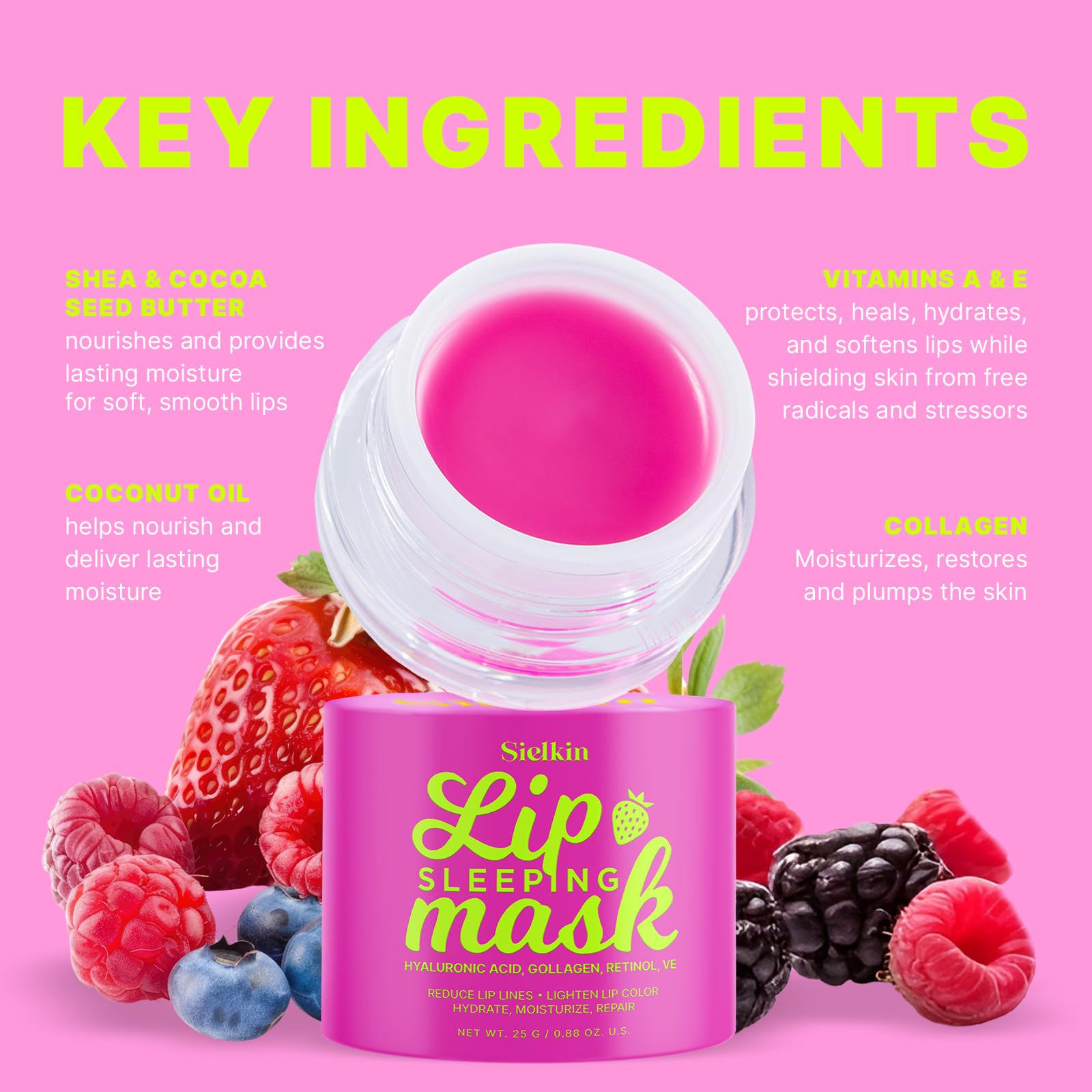 - KEEP YOUR LIPS HYDRATED ALL DAY LONG: Say goodbye to dryness with our lip sleeping mask. Packed with moisturizing ingredients such as Hyaluronic Acid, Shea & Cocoa Seed Butter, Beeswax, Grape Seed Oil, Vitamins A, E, this lip masks beats traditional lip balms and lip butters for intense hydration. Enjoy a hint of refreshing strawberry scent for supple lips