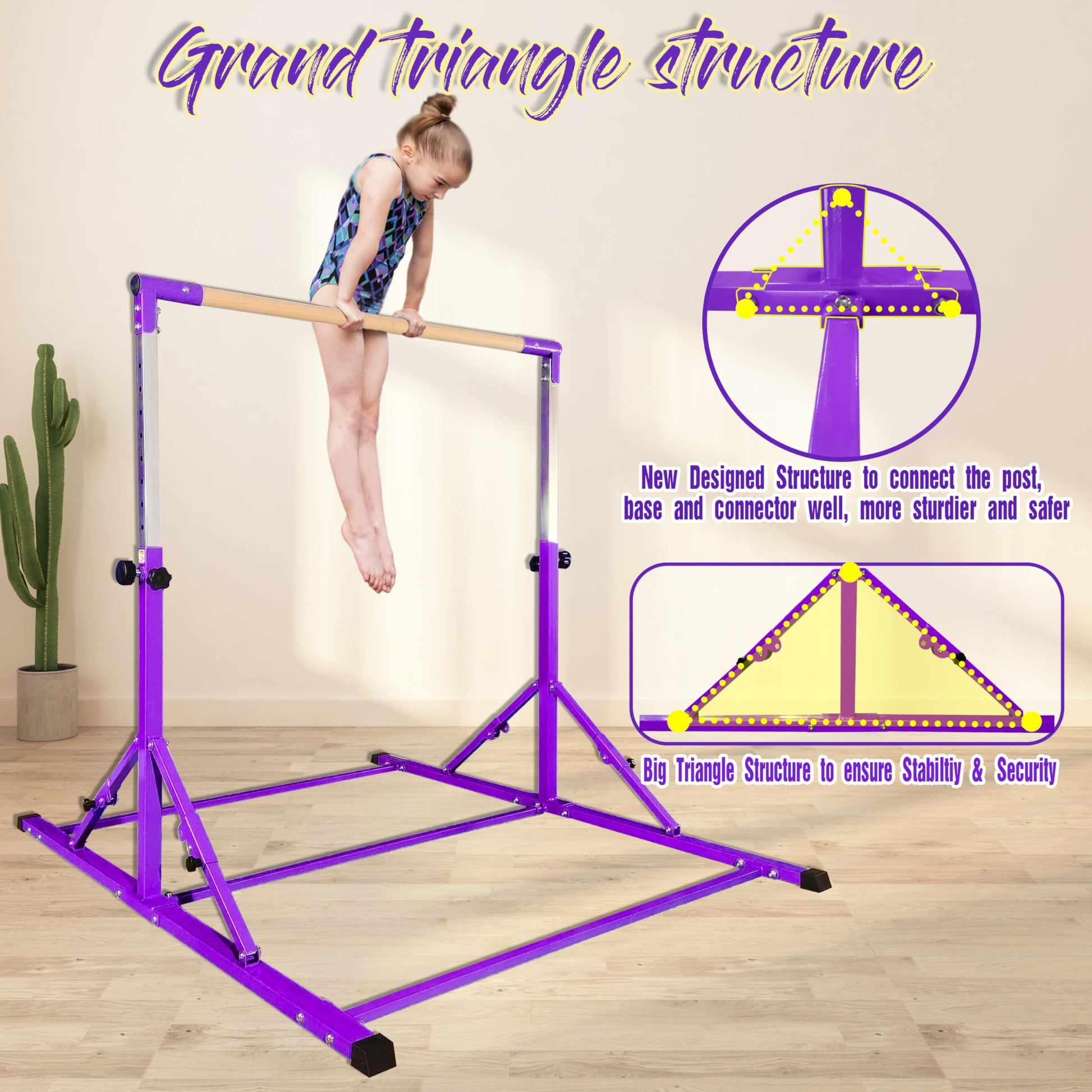 - Professional Gymnastics Bar: It could bring unexpected benefits to gymnasts. Thickened materials, big triangle Structure, three connectors, 6 ft bases…all offer exceptional versatility and durability for athletes of all levels. It can bear up to 500 LBS