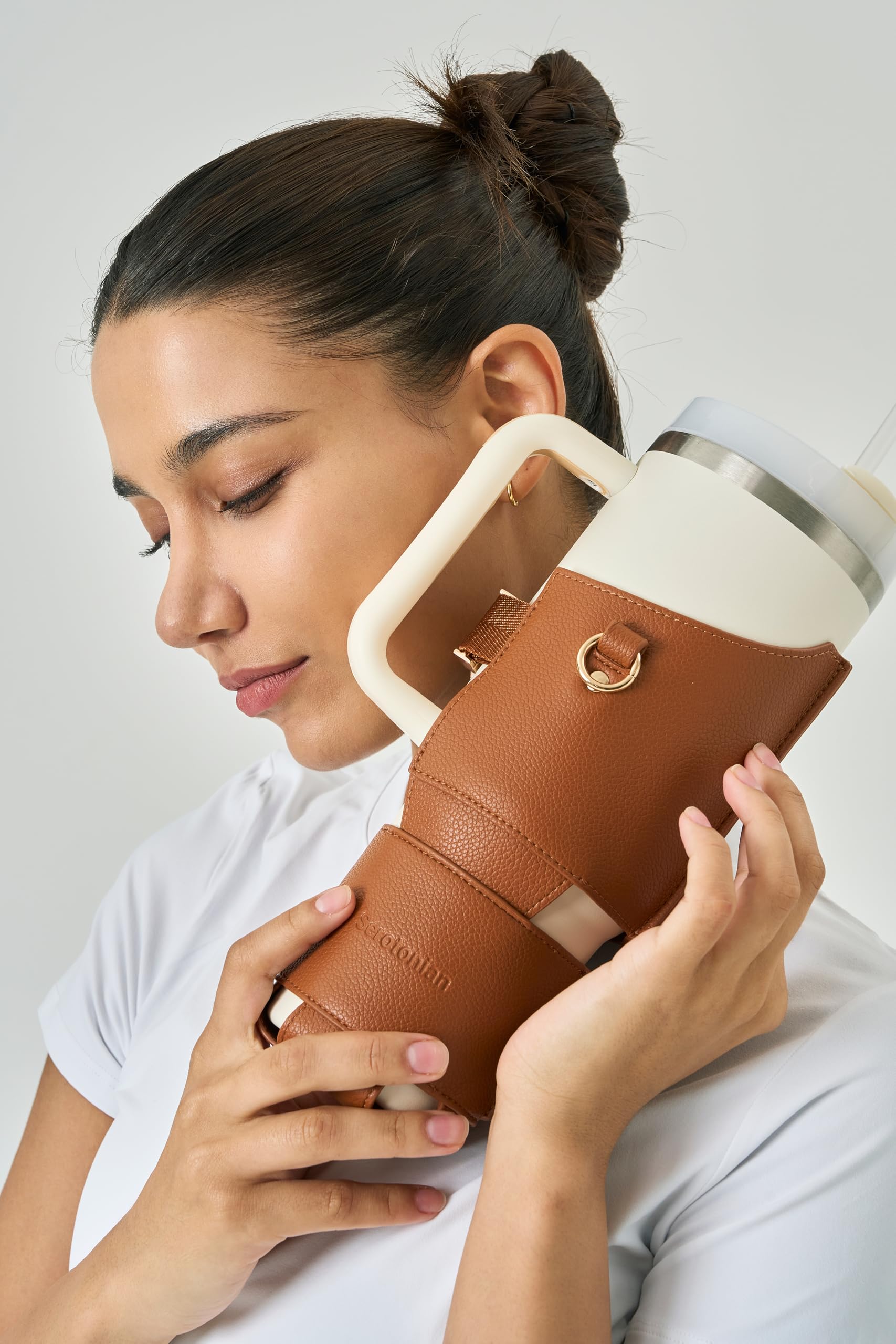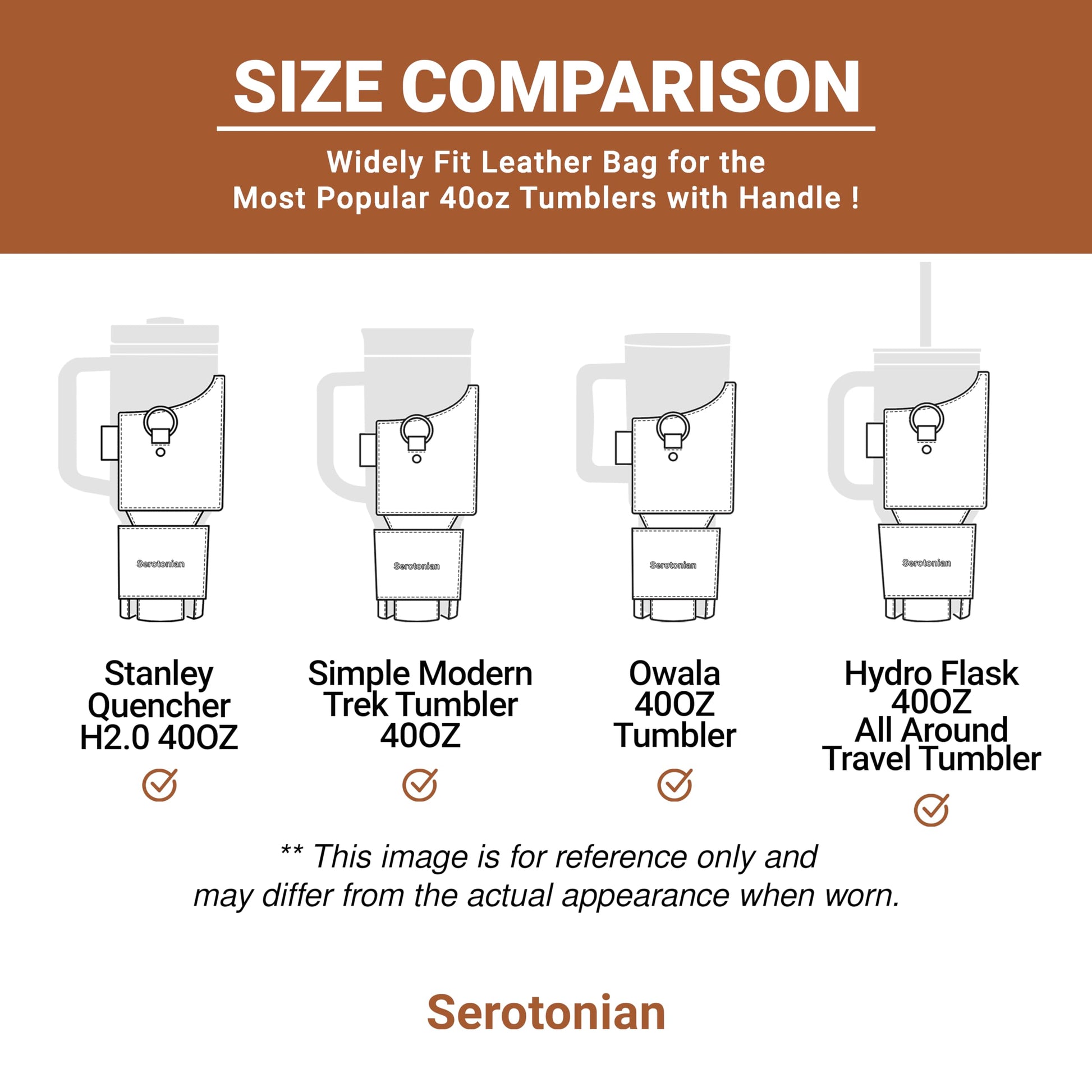 - 【Designed for Stanley & More】 Looking for the perfect bag to carry your Stanley cups? Our water bottle holder with strap is uniquely designed for Stanley 40oz and Simple Modern 40oz tumblers with handle. Our metal buckle strap provides a snug fit for these tumblers and its fine stitch lines provide durability. Style your tumbler uniquely inside another layer beauty that lasts. Slim leather styled bottom to put the tumbler inside the car cup holder snuggly.