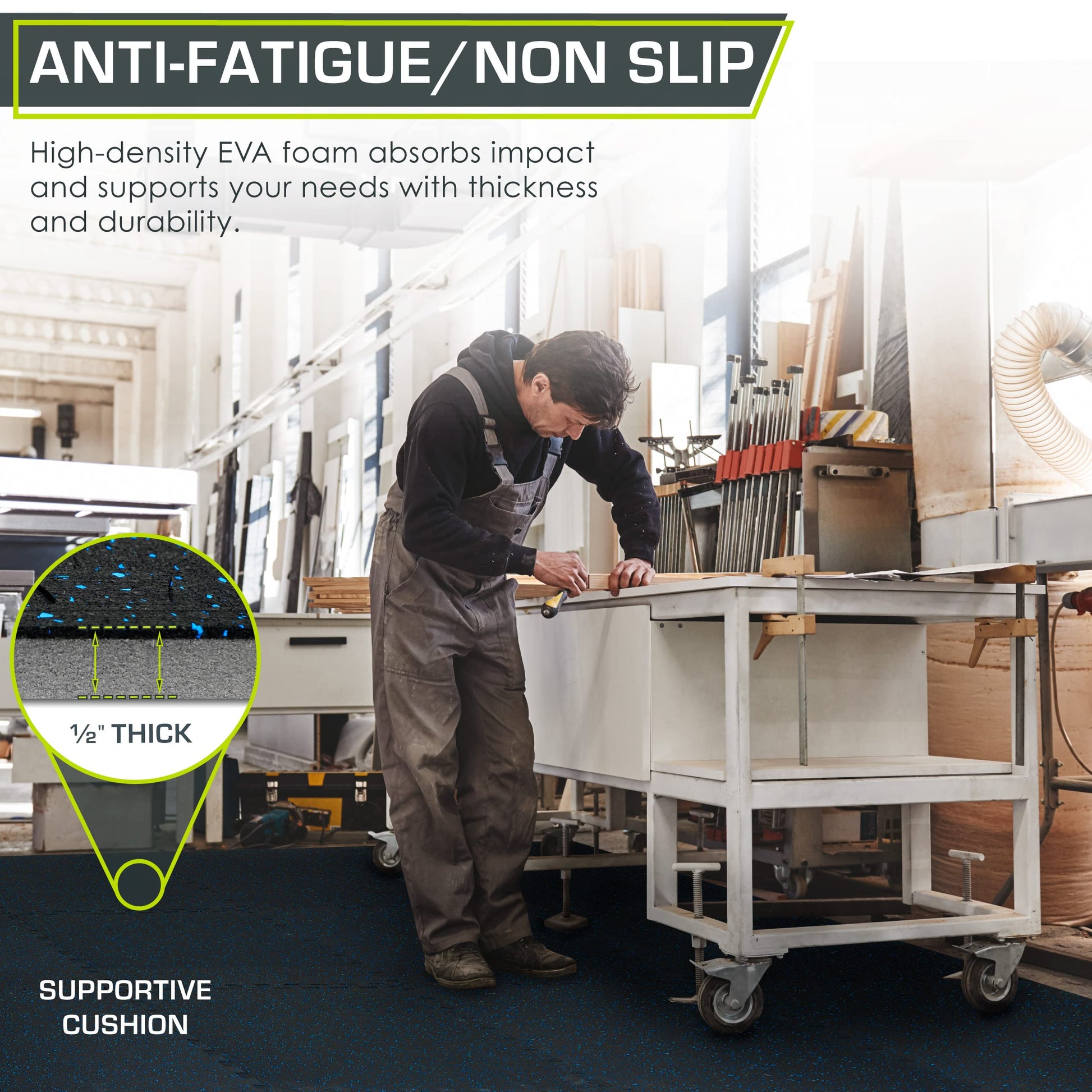 Details: he ProsourceFit Rubber Top Exercise Puzzle Mat ½ inch turns any space into a cushioned, comfortable workout space. The dual layer design creates an impact-absorbent and stable surface to protect your floors and yourself. The speckled rubber top layer creates a non-slip surface that stabilizes and stays intact with your shoes on or off. The EVA foam bottom layer adds sturdy support and padding to absorb impacts from equipment, but won’t sink in. The lightweight tiles make assembly and disassembly simple and quick. The puzzle edges interlock and secure each tile together to stay in place while you’re working out. The included border pieces provide clean edges for a polished look.