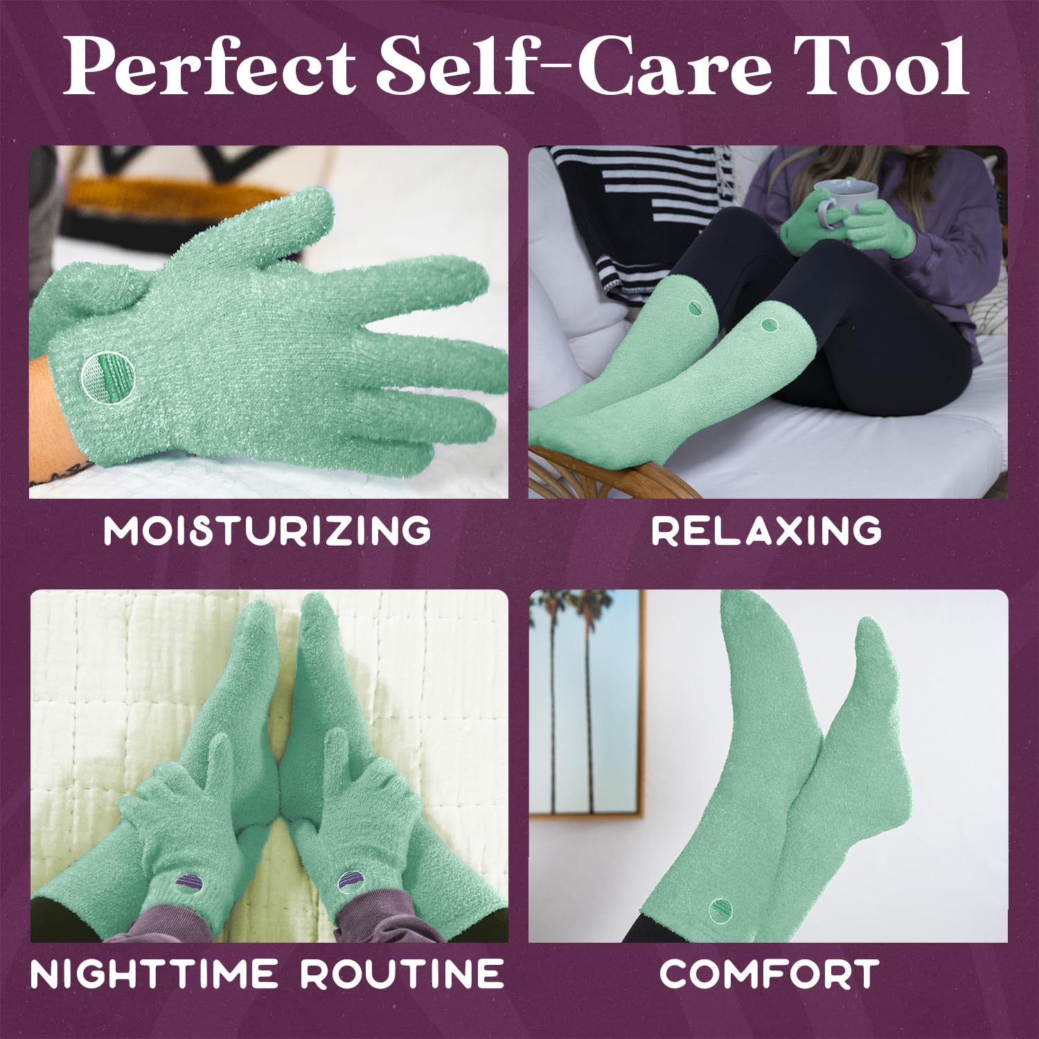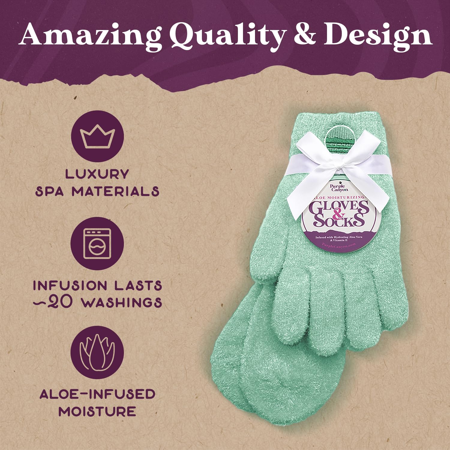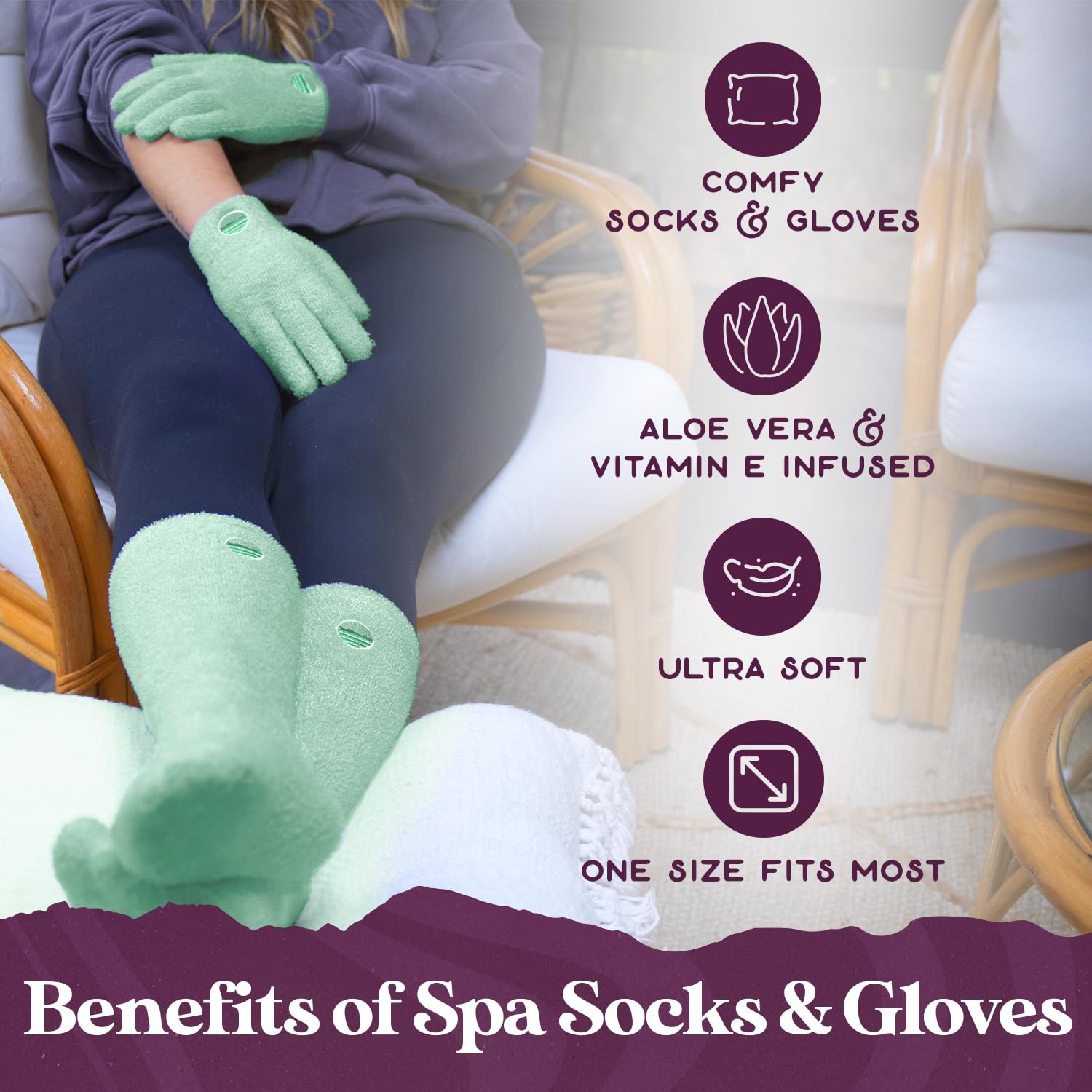 - πππ πππππππππ ππ ππππ: Pamper yourself and let our teal spa socks and gloves help rejuvenate your feet and hands; aloe plus vitamin E work to moisturize and lock in essential nutrients for soft, silky smooth skin. These ultra-soft teal fuzzy spa moisturizing socks and aloe gloves offer a purely luxurious and relaxing experience.