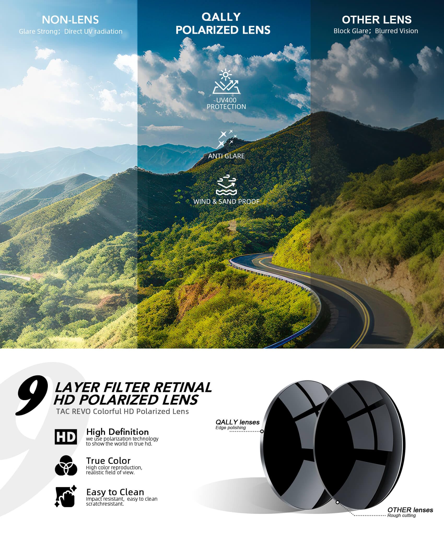- π Advanced UV400 Polarized Lens βΆ QALLY men sunglasses feature advanced lenses that not only reduce glare but also minimize eye strain effectively. The specialized UV400 protection coating ensures comprehensive shielding against harmful UVA and UVB rays, making polarized sunglasses ideal for protecting your vision under bright conditions.