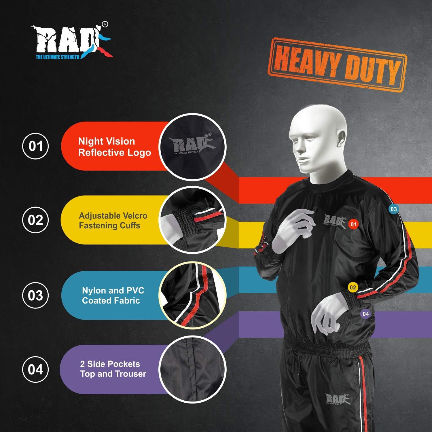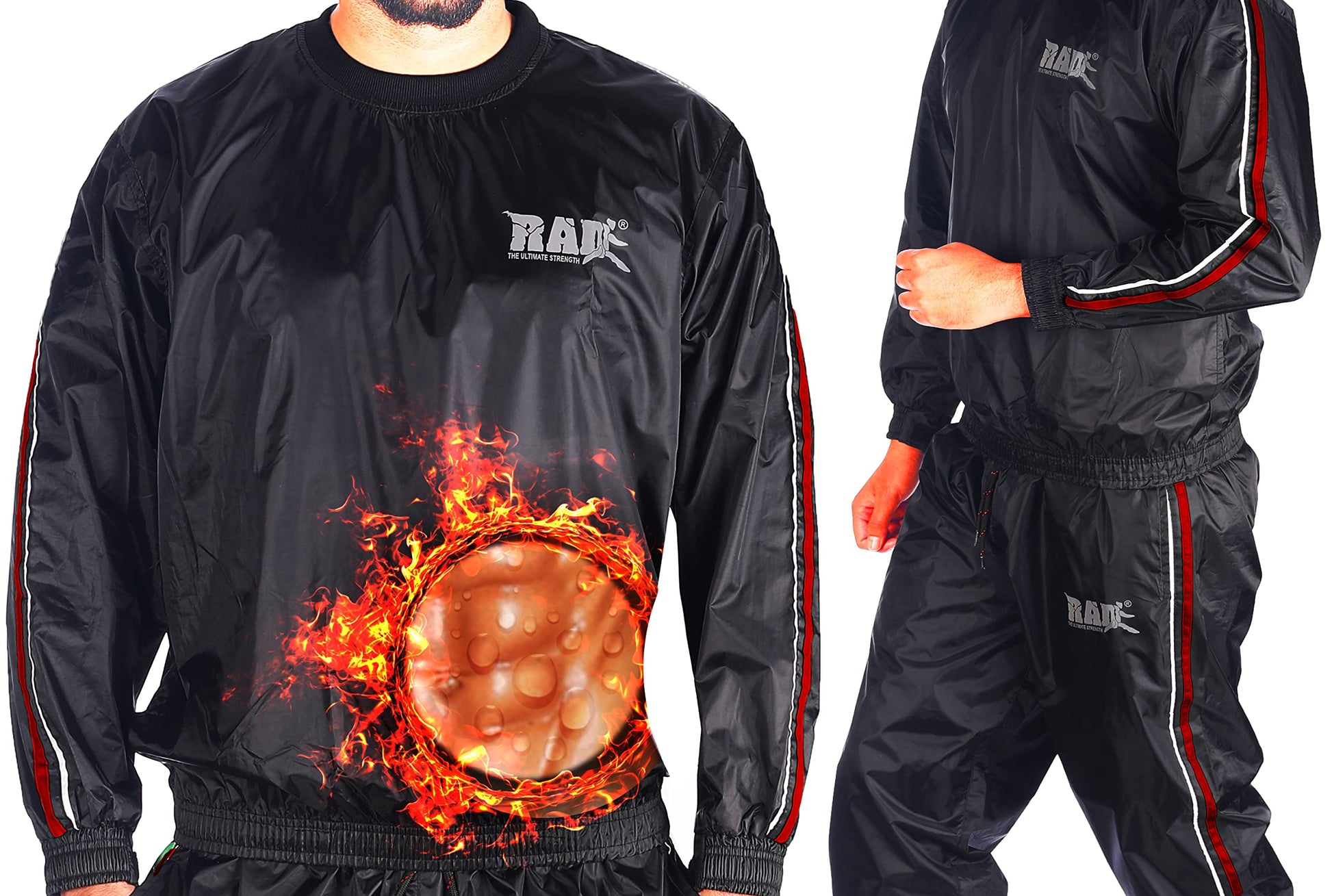 Details: Heavy Duty RAD Weight loss Sauna Suit looks just like a high-fashion sweat suit on the outside, but has a concealed unique EVA nylon material.Complete set includes pullover top and pants. Rugged elastic surrounds the cuffs, waist, waistline and ankles for unbelievable air retention and sauna action. Oversized fit provides top results. The RAD Weight loss Sauna Suit allows you to triple your weight loss by using your own body's natural heat to melt away unwanted fat and water weight.Once you put on the RAD Sauna Suit, all you have to do is move around and exercise to stimulate the body.Through perspiration, the body will naturally excrete unwanted pounds. RAD Sauna Suit works just like the expensive warm body-wrap treatments at the luxurious health spas.The RAD Sauna Suit will help you reduce your entire body weight, evenly eliminate cellulite, get rid of that unattractive stomach pouch, shrink those love handles,and improve muscle tone and definition all over.RAD Sauna Suit is an effective sweat aid which uses natural body heat generated from any type of low or intensive high-energy physical exercise to increase perspiration during your work out. This sweat excretion process through perspiration stimulates the entire body, thus helping to rid the body of excess water weight gain, and evenly melts away unwanted body fat!The RAD Weight loss Sauna Suit is designed as a unisex workout suit that will accommodate both men and women in a variety of comfortable sizes: M,L,XL,XXL,3XL,4XL,5XL,6XL.