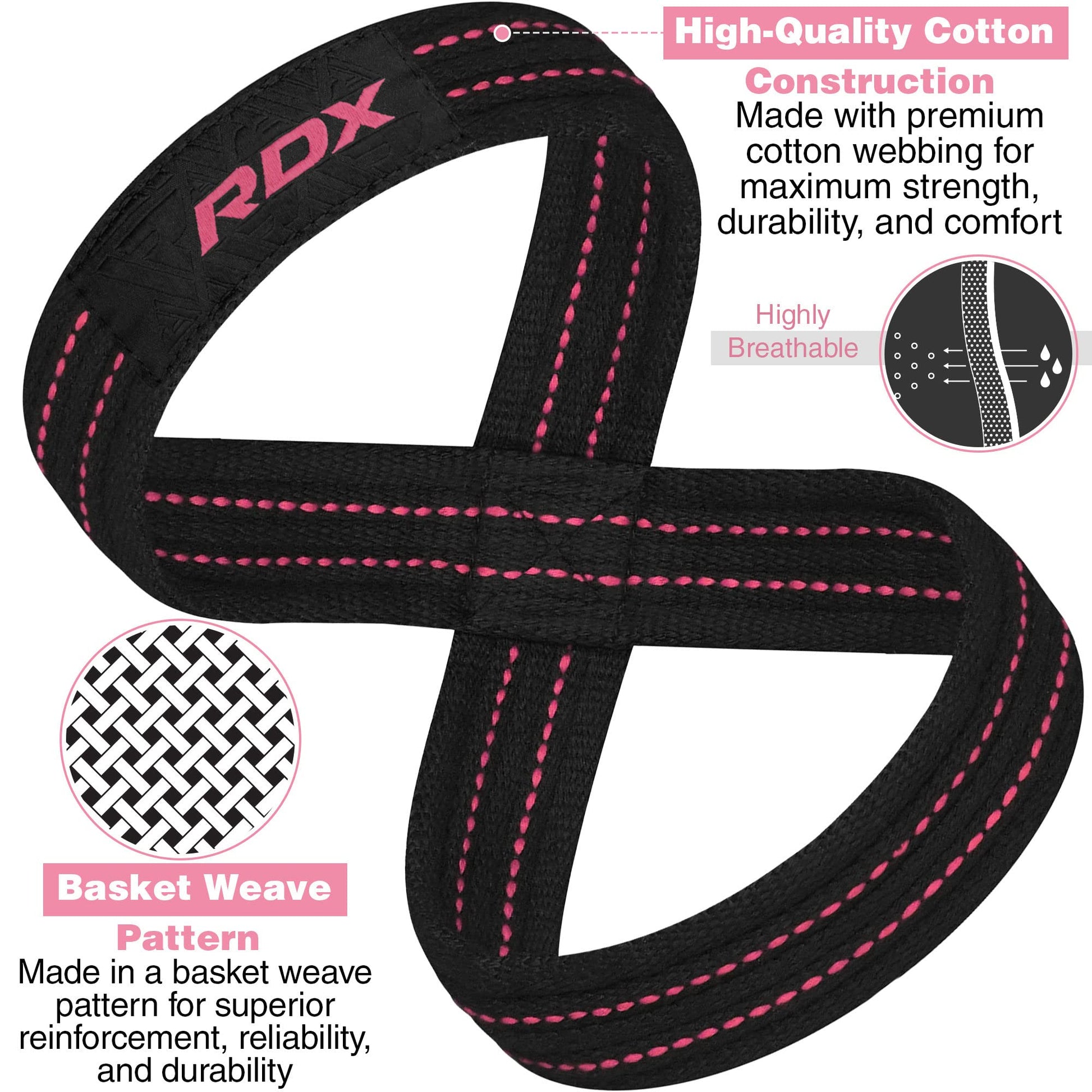 - LONG-LASTING DURABILITY The RDX figure 8 straps are made of high-quality cotton material that features cotton webbing, woven in a basket weave pattern for maximum durability and comfort. Designed like the digit 8, these weightlifting straps help facilitate bar-to-palm contact and provide a better grip and add maximum grip stability while further making exercises like Barbell Squats, Deadlifts, Shrugs Bench Presses, Barbell Lunges, and Barbell Rows, look easy.