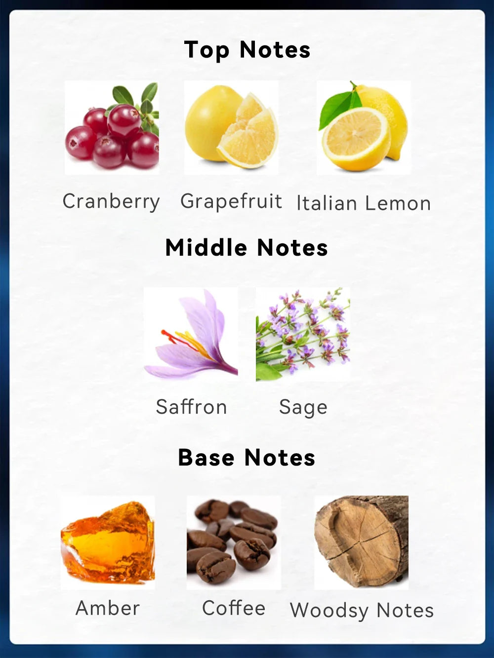 the base notes are amber, coffee and woody spices, which are calm and deep. Every scent is a perfect combination