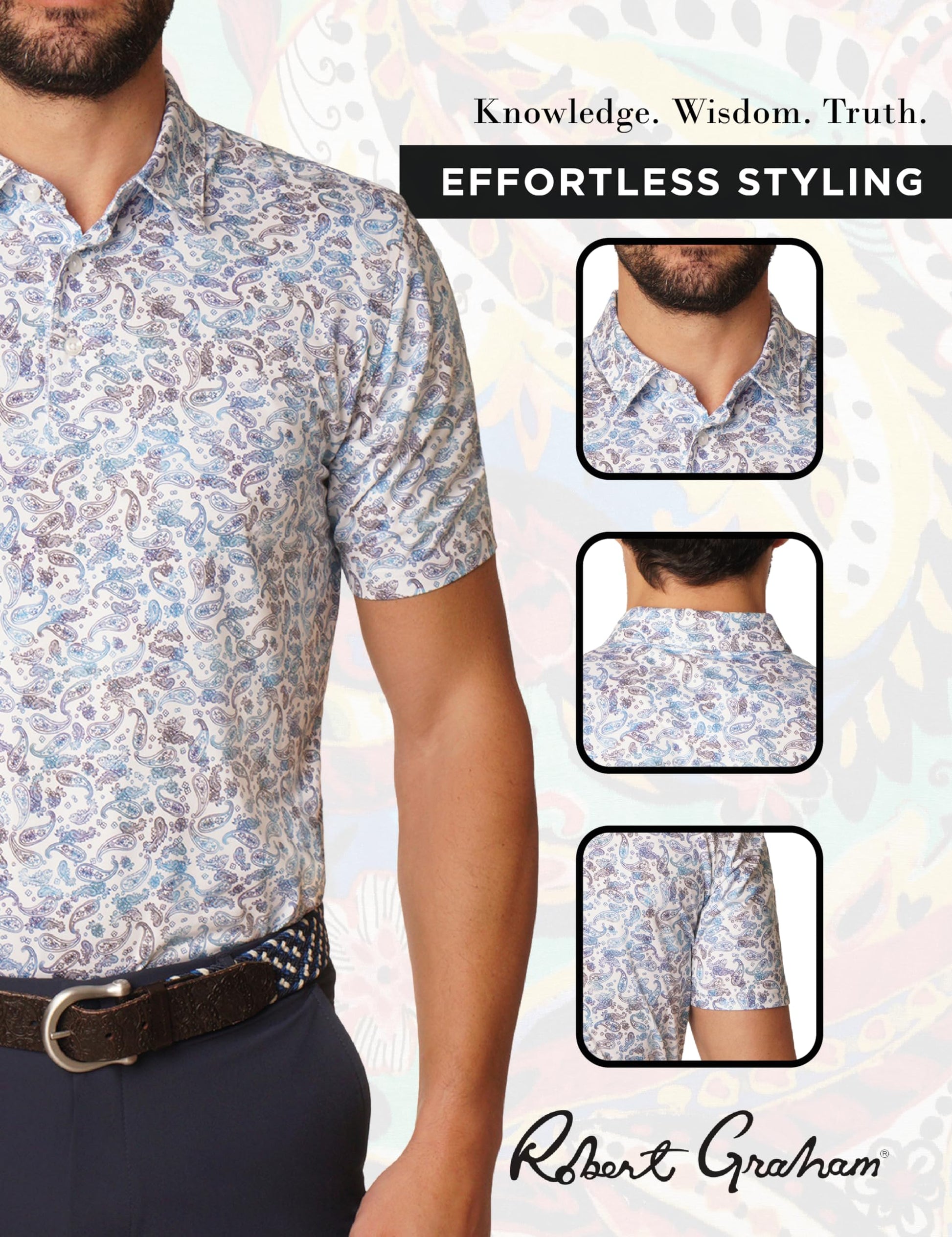 - VERSATILE STYLE: This polo golf shirt features an elegant paisley pattern and lovely colors. Great for year-round casual wear, it can be worn with your favorite pair of denim jeans or dressed up with a pair of dress pants.