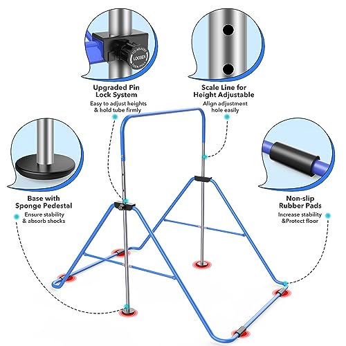 - [ Stable & Durable Bars ] - Expandable gymnastics bar comes with thickened & hardened steel tubes, the triangle structure design makes kip bar more stronger, ages 3-9 kids can flip freely and safely on the gym training bar which can stand up to 140 lbs