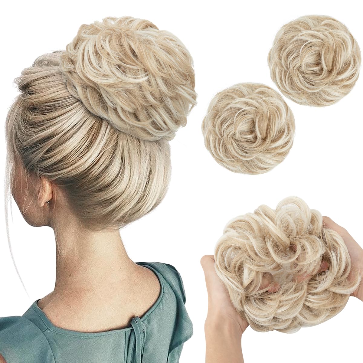 SARLA 2PCS Messy Hair Bun Hair Pieces Wavy Curly Synthetic Updo Fake Scrunchies Ponytail Extension for Women Cream Blonde