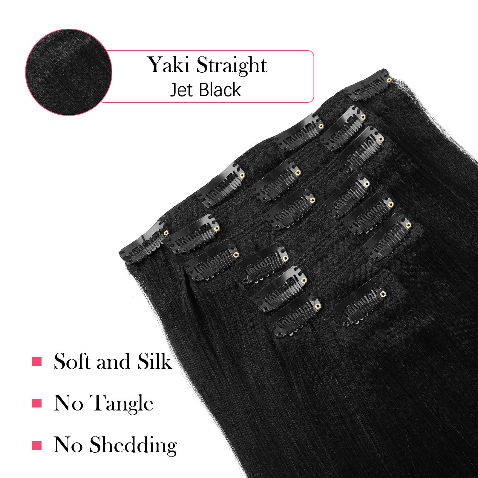Sassina Light Yaki Straight Clip in Hair Extensions Human Hair Double Wefts Clip in Extensions for African American Black Women 120 Grams Jet Black 16 Inch 7Pcs